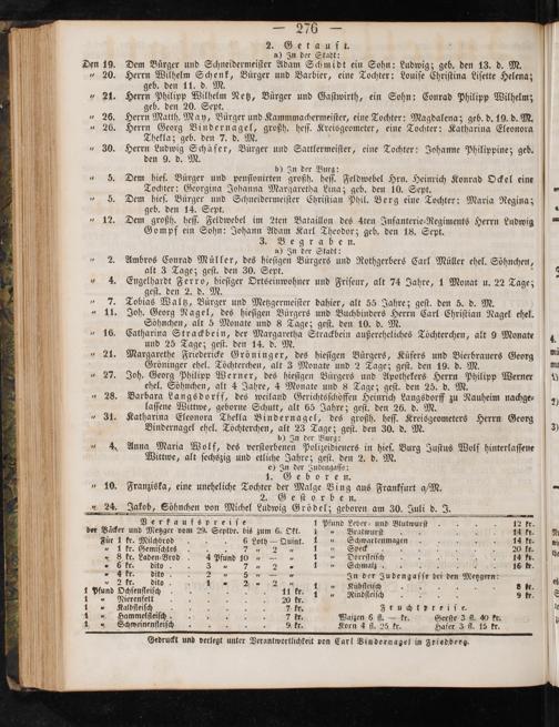 „ 20. Herrn Wilhelm Schenk, Bürger und Barbier, eine Tochter: Louiſe Chriſtina Liſette Helena; eb. den 11. d. M. „ 21. 9 Philipp Wilhelm Netz, Bürger und Gaſtwirth, ein Sohn: Conrad Philipp Wilhelm; eb. den 20. Sept. 2 99 750 Matth. May, Bürger und Kammmachermeiſter, eine Tochter: Magdalena; geb. d. 19. d. M. „ 26. Herrn Georg Bindernagel, großh. heſſ. Kreisgeometer, eine Tochter: Katharina Eleonora Thekla; geb. den 7. d. M. „30. Herrn Ludwig Schäfer, Bürger und Sattlermeiſter, eine Tochter: Johanne Philippine; geb. den 9. d. M. b) In der Burg: „ 5. Dem hieſ. Bürger und penſionirten großh. heſſ. Feldwebel Hrn. Heinrich Konrad Ockel eine Tochter: Georgina Johanna Margaretha Lina; geb. den 10. Sept. „ 5. Dem hieſ. Bürger und Schneidermeiſter Chriſtian Phil. Berg eine Tochter: Maria Regina; geb. den 14. Sept. „12. Dem großh. heſſ. Feldwebel im 2ten Bataillon des Aten Infanterie-Regiments Herrn Ludwig Gompf ein Sohn: Johann Adam Karl Theodor; geb. den 18. Sept. grebe n. a) In der Stadt: „2. Ambros Conrad Müller, des hieſigen Bürgers und Rothgerbers Carl Müller ehel. Soͤhnchen, alt 3 Tage; geſt. den 30. Sept. 5 „ 4. Engelhardt 7 egen Ortseinwohner und Friſeur, alt 74 Jahre, 1 Monat u. 22 Tage; geſt. den 2. d. M. „ 7. Tobias Waltz, Bürger und Metzgermeiſter dahier, alt 55 Jahre; geſt. den 5. d. M. „11. Joh. Georg Nagel, des hieſigen Bürgers und Buchbinders Herrn Carl Chriſtian Nagel ehel. Söhnchen, alt 5 Monate und 8 Tage; geſt. den 10. d. M. „ 16. Catharina Strackbein, der Margaretha Strackbein außereheliches Töchterchen, alt 9 Monate und 25 Tage; geſt. den 14. d. M. „ 21. Margarethe Friedericke Gröninger, des hieſigen Bürgers, Küfers und Bierbrauers Georg Gröninger ehel. Töchterchen, alt 3 Monate und 2 Tage; geſt. den 19. d. M. „ 27. Joh. Georg Philipp Werner, des hieſigen Bürgers und Apothekers Herrn Philipp Werner ehel. Söhnchen, alt 4 Jahre, 4 Monate und 8 Tage; geſt. den 25. d. M. „28. Barbara Langsdorff, des weiland Gerichtsſchöffen Heinrich Langsdorff zu Nauheim nachge— laſſene Wittwe, geborne Schutt, alt 65 Jahre; geſt. den 26. d. M. „31. Katharina Eleonora Thekla Bindernagel, des großh. heſſ. Kreisgeometers Herrn Georg Bindernagel ehel. Töchterchen, alt 23 Tage; geſt. den 30. d. M. b) In der Burg:„ „ 4. Anna Maria Wolf, des verſtorbenen Polizeidieners in hieſ. Burg Juſtus Wolf hinterlaſſene Wittwe, alt ſechszig und etliche Jahre; geſt. den 2. d. M. c) In der Judengaſſe: een „10. Franziska, eine uneheliche Tochter der Malge Bing aus Frankfurt aM. et erb en „24. Jakob, Söhnchen von Michel Ludwig Grödel; geboren am 30. Juli d. J. Verkaufspreiſe 1 Pfund Leber⸗ und Blutwuir ff der Backer und Metzger vom 29. Septbr. bis zum 6. Okt. 1„ Bratwurſt 2 5 5 4. 14 kr. Für 1 kr. Milchbrod... 6 Loth— Quint. 1 Schwartenmagen 14 kr.