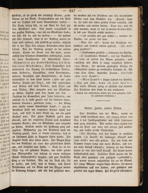 gluͤcklich, ob ſie gleich alle prächtige Kleider, große Sterne an der Bruſt, Diamantketten um den Hals und die Taſchen voll neuer Kronenthaler hatten.— Die Sache verzog ſich, da am Ende bei Hofe gar kein Glücklicher war. Nun wurde ausgeſchellt in der großen Reſidenz,„wo ſich ein Glücklicher fande, der ſolle ſich da und da melden.“— Es meldete ſich aber niemand, denn in der Reſidenz waren die Leute weit entfernt, ſich glücklich zu preiſen, obgleich ſich in der That kein einziger Krawaller unter ihnen befand. Von der Reſidenz gieng's in die andern Städte. Damit die Sache eine Art hatte, wurde endlich eine beſondere Commiſſion niedergeſetzt, welche bei ihren Ausſchreiben die Ueberſchrift führte: „Commiſſion zur Herbeiſchaffung des Hem— des eines Glücklichen.“ Dieſe Commiſſion hielt wöchentlich ihre Sitzung bei verſchloſſenen Thüren, hatte Sekretäre, Cancelliſten, einen Botenmeiſter, mehrere Acceſſiſten und Kanzleidiener; ſie ſandte Commiſſäre in dem Land herum(jeder mit zehn Gulden Diäten per Tag), und ließ ausforſchen nach Suden und nach Norden, nach Oſten und nach Weſten. Aber nirgends war ein Glücklicher zu finden, folglich auch kein Hemd von ihm.— Nachdem die Commiſſion zwei Jahre beſtanden, und umſonſt(d. h. nicht gratis wie die Lateiner ſagen, ſondern frustra) gearbeitet hatte,— der König aber wurde immer bedenklicher krank,— zog der Präſident ſelbſt mit doppelten Diäten durch das Land, und hielt in jeder Stadt an, wo ein guter Gaſthof war. Der guten Gaſthöfe gab's zwar züberall, und bei doppelten Diäten auch manchmal doppelte Kreide; aber ein Glücklicher war nirgends zu finden. Endlich wurde die Hoffnung ganz auf⸗ gegeben. Mißmuthig zog der Präſident nach der Reſidenz zurück, denn er konnte erwarten, daß er im ſchlimmen Falle in Ungnade fallen würde. Ein Unglück bleibt aber ſelten allein. Der Wagen ſtürzt bei der Rückfahrt an einer ſehr gefährlichen Stelle zum, und nirgends war Hülfe.— Doch ja, in der Nähe lag ein geſunder Bruder, der hatte gerade ſſein Mittagseſſen(es beſtand in einem tüchtigen Stücke Schwarzbrod) verzehrt, und zum Nachtiſche ſſang er ein Liedchen. Wie der die Noth ſah, lief er herbei, und half, was er konnte, dem Herrn Präſidenten auf die Beine und den Wagen wieder in Ordnung bringen; und als das geſchehen war,