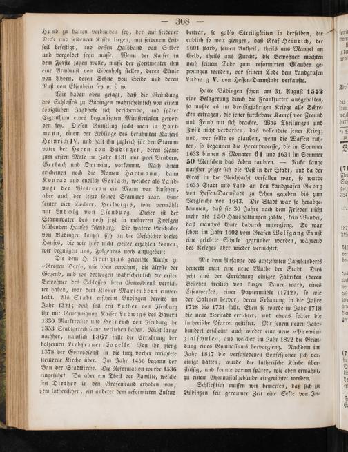 Hatte Büdingen ſchon am 31. Auguſt 1552 eine Belagerung durch die Frankfurter ausgehalten, ſo mußte es im dreißigjährigen Kriege alle Schre— cken ertragen, die jener furchtbare Kampf von Freund und Feind mit ſich brachte. Was Theilungen und Zwiſt nicht verdarben, das vollendete jener Krieg; und, wer ſollte es glauben, wenn die Waffen ruh— ten, ſo begannen die Hexenproceſſe, die im Sommer 1633 binnen 8 Monaten 64 und 1634 im Sommer 50 Menſchen das Leben raubten.— Nicht lange nachher zeigte ſich die Peſt in der Stadt, und da der Graf in die Reichsacht verfallen war, ſo wurde 1635 Stadt und Land an den Landgrafen Georg von Heſſen-Darmſtadt zu Lehen gegeben bis zum Vergleiche von 1643. Die Stadt war ſo herabge— kommen, daß ſie 30 Jahre nach dem Frieden nicht mehr als 150 Haushaltungen zählte; kein Wunder, daß manches Gute dadurch untergieng. So war ſchon im Jahr 1602 vom Grafen Wolfgang Ernſt eine gelehrte Schule gegründet worden, während des Krieges aber wieder vernichtet.