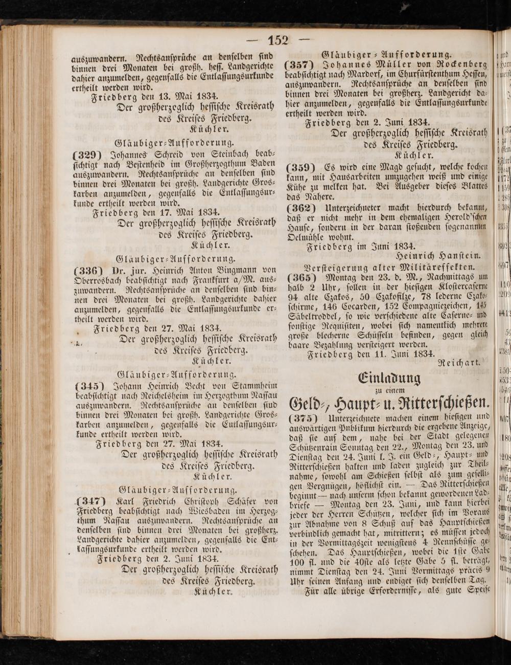 Gläubiger-Aufforderung. (329) Johannes Schreid von Steinbach beab⸗ ſichtigt nach Beſtenheid im Großherzogthum Baden auszuwandern. Rechtsanſprüche an denſelben ſind binnen drei Monaten bei großh. Landgerichte Gros— karben anzumelden, gegenfalls die Entlaſſungsur— kunde ertheilt werden wird. Friedberg den 17. Mai 1834. Der großherzoglich heſſiſche Kreisrath des Kreiſes Friedberg. Küchler. Gläubiger- Aufforderung. (336) Dr. jur. Heinrich Anton Bingmann von Oberrosbach beabſichtigt nach Fraukfurt a M. aus— zuwandern. Rechtsanſprüche an denſelben ſind bin⸗ nen drei Monaten bei großh. Landgerichte dahier anzumelden, gegenfalls die Entlaſſungsurkunde er— theilt werden wird. Friedberg den 27. Mai 1834. Der großherzoglich heſſiſche Kreisrath des Kreiſes Friedberg. Küchler. Gläubiger- Aufforderung. (345) Johann Heinrich Becht von Stammheim beabſichtigt nach Reichelsheim im Herzogthum Naſſau auszuwandern. Rechtsanſprüche an denſelben ſiud binnen drei Monaten bei großh. Landgerichte Gros— karben anzumelden, gegenfalls die Eutlaſſungsur— kunde ertheilt werden wird. Friedberg den 7. Mai 1834. Der großherzoglich heſſiſche Kreisrath des Kreiſes Friedberg. Küchler. Gläubiger-Aufforderung. (347) Karl Friedrich Chriſtoph Schäfer von Friedberg beabſichtigt nach Wiesbaden im Herzog— thum Naſſau auszuwandern. Rechtsanſprüche an denſelben ſind binnen drei Monaten bei großherz. Landgerichte dahier anzumelden, gegenfalls die Ent— laſſungsurkunde ertheilt werden wird. Friedberg den 2. Juni 1834. Der großherzoglich heſſiſche Kreisrath des Kreiſes Friedberg. Küchler.