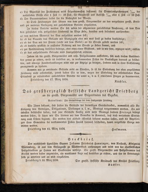 . 10 Kommen neu zu errichtende Gebäude nicht an Straßen, ſo iſt die Einſendung der oben angeführten d ö U 6 Zeichnung nicht erforderlich, jedoch haben Sie in dem, wegen der Einholung der erforderlichen Bau— d 1 Erlaubniß zu erſtattenden gutächtlichen Berichte die unter a, b u. f. erwähnten Fragen zu beantworten. d 1 N 29 0 100 Friedberg den 17. März 1834. 2 8 b Kuͤchler. ö. 6 d 110 f dias großberzoglich heſſiſche Landgericht Friedberg“ ö 0 an die großh. Buͤrgermeiſter und Beigeordneten des Bezirkes. 1 1100 1 4 Betreffend: Die Geſchäftstage bei dem Landgerichte Friedberg. N Wie Ihnen bekannt, ſind ſeither die Geſchäfte der freiwilligen Gerichtsbarkeit, namentlich alſo Be⸗ 1