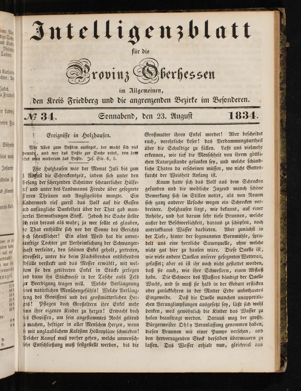 Für Holzhauſen war der Monat Juli bis zum 3 Alutzuſt die Schreckenszeit, indem ſich unter den eſang der ſcherzenden Schnitter ſchauerlicher Hülfe— uf und unter des Landmanns Freude über geſegnete FTuren Thränen und Angſtgeſtöhn mengte. Ein fendermord rief zuerſt das Volk auf die Gaſſen urd anfängliche Dunkelheit über der That gab man— derlei Vermuthungen Stoff. Jedoch die Sache ſtellte ſih rein heraus als wahr; ja wer ſollte es glauben, de That enthüllte ſich vor der Sonne des Gerichts uch ſcheußlicher! Ein altes Weib hat die unver⸗ nünftige Tochter zur Verheimlichung der Schwanger— haft verleitet, den ſchönen Enkel geholt, zertreten, aͤdroſſelt, unter die beim Flachsbrechen entſtehenden fälle verſteckt und das Meſſer erwählt, mit wel— dem ſie den getödteten Enkel in Stücke zerlegen und dann ihn Stückweiſe in der Taſche aufs Feld ur Beerdigung tragen will. Welche Verläugnung ines natürlichen Menſchengefühls! Welche Verläug— nung des Gewiſſens und des großmütterlichen Her— ens! Pflegen doch Großeltern ihre Enkel mehr ann ihre eigenen Kinder zu herzen! Erwacht doch dus Gewiſſen, um ſein angeſtammtes Recht geltend u machen, heftiger in aller Menſchen Herzen, wenn ſe mit unglaublichem Kaltſinn Höllenpläne ſchmieden! Welcher Kampf muß vorher gehen, welche unmenſch— che Entſchließung muß feſtgeſtellt werden, bis die