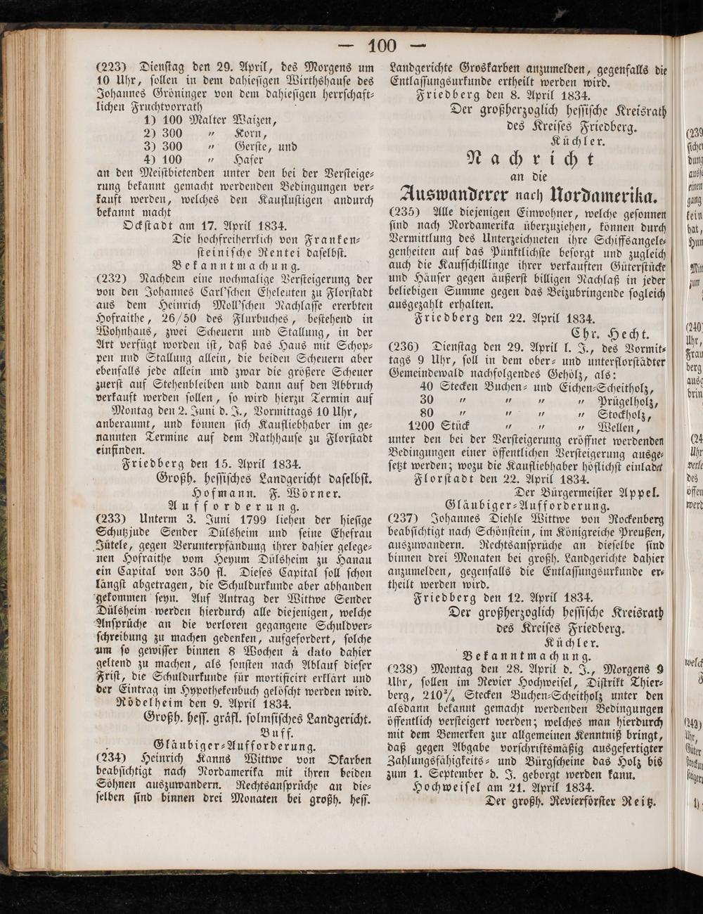 an den Meiſtbietenden unter den bei der Verſteige⸗ rung bekannt gemacht werdenden Bedingungen ver— kauft werden, welches den Kaufluſtigen andurch bekannt macht Ockſtadt am 17. April 1834. Die hochfreiherrlich von Franken— ſteiniſche Rentei daſelbſt. Bekanntmachung. (232) Nachdem eine nochmalige Verſteigerung der von den Johannes Carl'ſchen Eheleuten zu Florſtadt aus dem Heinrich Moll'ſchen Nachlaſſe ererbten Hofraithe, 26/50 des Flurbuches, beſtehend in Wohnhaus, zwei Scheuern und Stallung, in der Art verfügt worden iſt, daß das Haus mit Schop— pen und Stallung allein, die beiden Scheuern aber ebenfalls jede allein und zwar die großere Scheuer zuerſt auf Stehenbleiben und dann auf den Abbruch verkauft werden ſollen, ſo wird hierzu Termin auf Montag den 2. Juni d. J., Vormittags 10 Uhr, anberaumt, und konnen ſich Kaufliebhaber im ge— nannten Termine auf dem Rathhauſe zu Florſtadt einfinden. Friedberg den 15. April 1834. Großh. heſſiſches Landgericht daſelbſt. Hofmann. F. Wörner. Alu f ford er un g. (233) Unterm 3. Juni 1799 liehen der hieſige Schutzjude Sender Dülsheim und ſeine Ehefrau