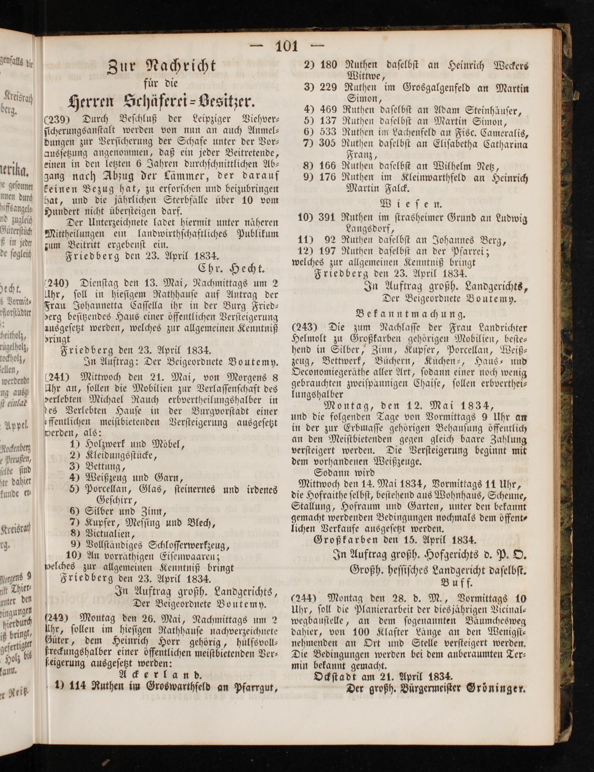 2) 180 Ruthen daſelbſt an Heinrich Weckers Wittwe, 3) 229 Ruthen im Grosgalgenfeld an Martin Simon, 4) 469 Ruthen daſelbſt an Adam Steinhäuſer, 5) 137 Ruthen daſelbſt an Martin Simon, 6) 533 Ruthen im Lachenfeld an Fisc. Cameralis, 7) 305 Ruthen daſelbſt an Eliſabetha Catharina Franz, 8) 166 Ruthen daſelbſt an Wilhelm Netz, 9) 176 Ruthen im Kleinwarthfeld an Heinrich Martin Falck. Wieſen. 10) 391 Ruthen im ſtrasheimer Grund an Ludwig Langsdorf, 11) 92 Ruthen daſelbſt an Johannes Berg, 12) 197 Ruthen daſelbſt an der Pfarrei; welches zur allgemeinen Kenntniß bringt Friedberg den 23. April 1834. In Auftrag großh. Landgerichts, Der Beigeordnete Boutemy. Bekanntmachung. (243) Die zum Nachlaſſe der Frau Landrichter Helmolt zu Großkarben gehörigen Mobilien, beſte— hend in Silber, Zinn, Kupfer, Porcellan, Weiß— zeug, Bettwerk, Büchern, Küchen-, Haus- und Oeconomiegeräthe aller Art, ſodann einer noch wenig gebrauchten zweiſpannigen Chaiſe, ſollen erbverthei— lungshalber Montag, den 12. Mai 1834, und die folgenden Tage von Vormittags 9 Uhr an in der zur Erbuaſſe gehörigen Behauſung öffentlich an den Meiſtbietenden gegen gleich baare Zahlung verſteigert werden. Die Verſteigerung beginnt mit dem vorhandenen Weißzeuge. Sodann wird Mittwoch den 14. Mai 1834, Vormittags 11 Uhr, die Hofraithe ſelbſt, beſtehend aus Wohnhaus, Scheune, Stallung, Hofraum und Garten, unter den bekannt gemacht werdenden Bedingungen nochmals dem öffent⸗ lichen Verkaufe ausgeſetzt werden. Großkarben den 15. April 1834.