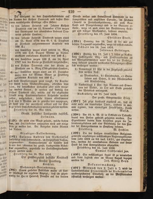 (395) Sonntag den 29. Juni iſt bei mir gut beſetzte Tanzmuſik anzutreffen, wozu ich hoͤflich einlade. Ockſtadt den 24. Juni 1834. Johannes Gröninger.