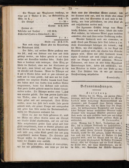 Mancher Landwirth wird mir einwenden, er müſſe Stroh zum Streuen für's Vieh haben u. ſ. w. Dieſe Einwendungen beſeitigen ſich dadurch, daß der Mohn, wie oben angeführt, in der Regel ins Brachfeld gepflanzt wird, wo ohnehin kein Getreide gezogen wird. Wenn nur jeder Landwirth ſeinen eignen Oelbedarf und noch einiges mehr pflanzt, wird im Ganzen ſchon viel gewonnen. Mehrere Oekonomen, mit denen ich über dieſen Gegenſtand Unterredungen hatte, haben ſich entſchloſſen, mit dem Mohnbau in dieſem Jahr eine Probe zu ma— chen. Das Reſultat bitte ich mir zur weiteren Veröffentlichung mitzutheilen.