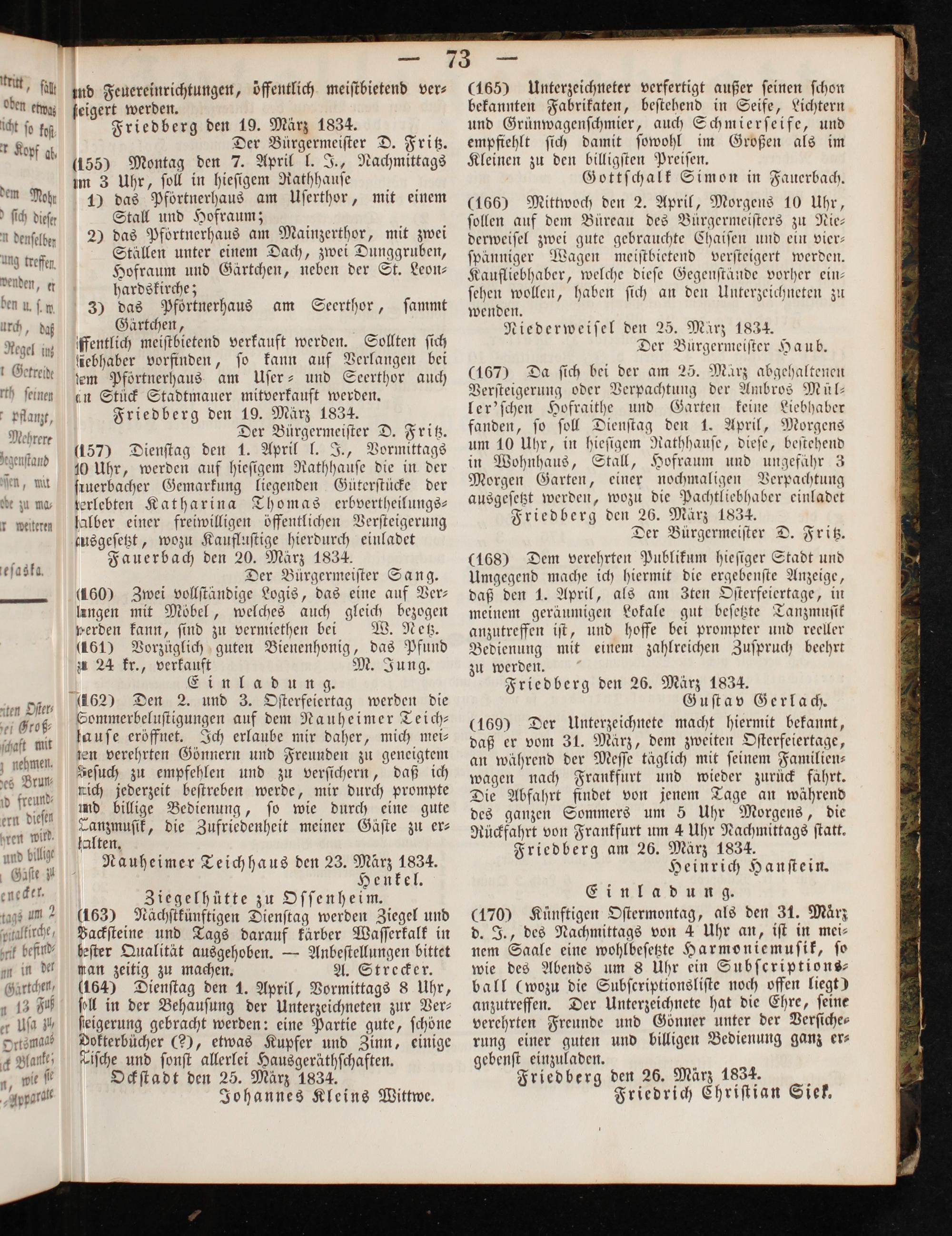 ffentlich meiſtbietend verkauft werden. Sollten ſich liebhaber vorfinden, ſo kann auf Verlangen bei em Pförtnerhaus am Uſer- und Seerthor auch an Stück Stadtmauer mitverkauft werden. Friedberg den 19. März 1834. Der Bürgermeiſter D. Fritz. 157) Dienſtag den 1. April l. J., Vormittags 10 Uhr, werden auf hieſigem Rathhauſe die in der ſruerbacher Gemarkung liegenden Güterſtücke der erlebten Katharina Thomas erbvertheilungs— lalber einer freiwilligen öffentlichen Verſteigerung tusgeſetzt, wozu Kaufluſtige hierdurch einladet Fauerbach den 20. März 1834. Der Bürgermeiſter Sang. (460) Zwei vollſtändige Logis, das eine auf Ver— lungen mit Möbel, welches auch gleich bezogen perden kann, ſind zu vermiethen bei W. Netz. (161) Vorzüglich guten Bienenhonig, das Pfund zu 24 kr., verkauft M. Jung. Einladung. und 3. Oſterfeiertag werden die Sommerbeluſtigungen auf dem Nauheimer Teich— lauſe eröffnet. Ich erlaube mir daher, mich mei— zen verehrten Gönnern und Freunden zu geneigtem Feſuch zu empfehlen und zu verſichern, daß ich mich jederzeit beſtreben werde, mir durch prompte ind billige Bedienung, ſo wie durch eine gute Tanzmuſik, die Zufriedenheit meiner Gäſte zu er— alten. Nauheimer Teichhaus den 23. März 1834. Henkel. Ziegelhütte zu Oſſenheim. (163) Nächſtkünftigen Dienſtag werden Ziegel und Backſteine und Tags darauf kärber Waſſerkalk in beſter Qualität ausgehoben.— Anbeſtellungen bittet man zeitig zu machen. A. Strecker. (164) Dienſtag den 1. April, Vormittags 8 Uhr, ſoll in der Behauſung der Unterzeichneten zur Ver⸗ ſeigerung gebracht werden: eine Partie gute, ſchöne Dokterbücher(2), etwas Kupfer und Zinn, einige Tiſche und ſonſt allerlei Hausgeräthſchaften. Ockſtadt den 25. März 1834. Johannes Kleins Wittwe.