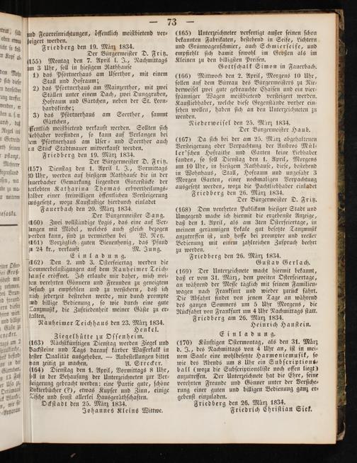 (166) Mittwoch den 2. April, Morgens 10 Uhr, ſollen auf dem Büreau des Bürgermeiſters zu Nie— derweiſel zwei gute gebrauchte Chaiſen und ein vier— ſpänniger Wagen meiſtbietend verſteigert werden. Kaufliebhaber, welche dieſe Gegenſtände vorher ein— ſehen wollen, haben ſich an den Unterzeichneten zu wenden. Niederweiſel den 25. März 1834. Der Bürgermeiſter Haub. (167) Da ſich bei der am 25. Marz abgehaltenen Verſteigerung oder Verpachtung der Ambros Muͤl— ler'ſchen Hofraithe und Garten keine Liebhaber fanden, ſo ſoll Dienſtag den 1. April, Morgens um 10 Uhr, in hieſigem Rathhauſe, dieſe, beſtehend in Wohnhaus, Stall, Hofraum und ungefähr 3 Morgen Garten, einer nochmaligen Verpachtung ausgeſetzt werden, wozu die Pachtliebhaber einladet Friedberg den 26. März 1834. Der Bürgermeiſter D. Fritz. (168) Dem verehrten Publikum hieſiger Stadt und Umgegend mache ich hiermit die ergebenſte Anzeige, daß den 1. April, als am Zten Oſterfeiertage, in meinem geräumigen Lokale gut beſetzte Tanzmuſik anzutreffen iſt, und hoffe bei prompter und reeller Bedienung mit einem zahlreichen Zuſpruch beehrt zu werden. Friedberg den 26. März 1834. Guſtav Gerlach. (169) Der Unterzeichnete macht hiermit bekannt, daß er vom 31. Marz, dem zweiten Oſterfeiertage, an während der Meſſe täglich mit ſeinem Familien⸗ wagen nach Frankfurt und wieder zurück fährt. Die Abfahrt findet von jenem Tage an während des ganzen Sommers um 5 Uhr Morgens, die Rückfahrt von Frankfurt um 4 Uhr Nachmittags ſtatt. Friedberg am 26. März 1834. Heinrich Hanſtein. Eli nad un g (170) Künftigen Oſtermontag, als den 31. Marz d. J., des Nachmittags von 4 Uhr an, iſt in mei— nem Saale eine wohlbeſetzte Harmoniemuſik, ſo wie des Abends um 8 Uhr ein Subſeriptions— ball(wozu die Subſcriptionsliſte noch offen liegt) anzutreffen. Der Unterzeichnete hat die Ehre, ſeine verehrten Freunde und Gönner unter der Verſiche— rung einer guten und billigen Bedienung ganz er⸗ gebenſt einzuladen. Friedberg den 26. März 1834.. Friedrich Chriſtian Siek,