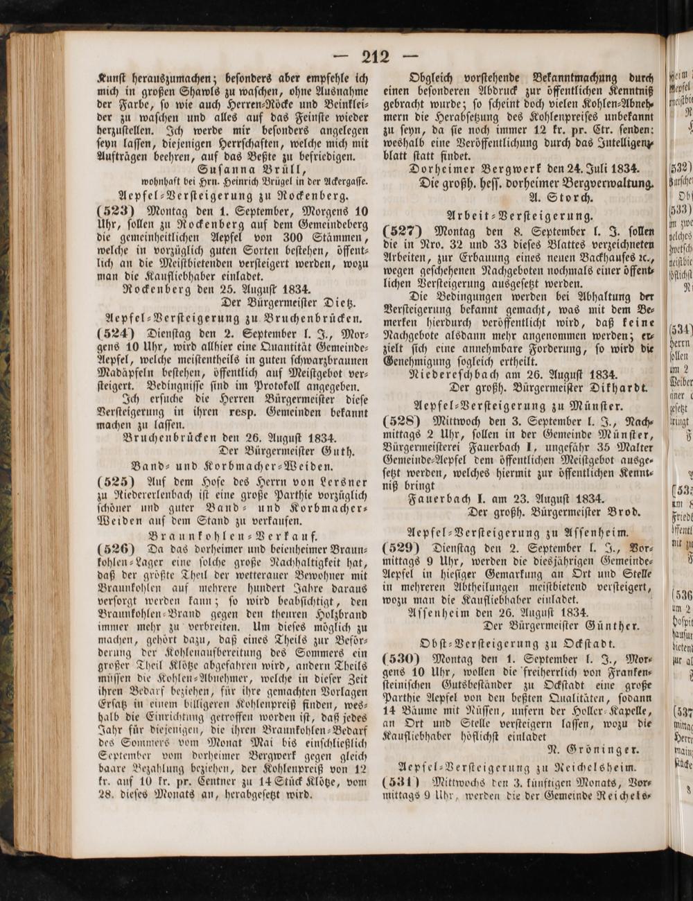 Der Bürgermeiſter Günther. Obſt-Verſteigerung zu Ockſtadt. (530) Montag den 1. September l. J., Mor⸗ gens 10 Uhr, wollen die freiherrlich von Franken— ſteiniſchen Gutsbeſtänder zu Ockſtadt eine große Parthie Aepfel von den beßten Qualitäten, ſodann 14 Bäume mit Nüſſen, unfern der Holler-Kapelle, an Ort und Stelle verſteigern laſſen, wozu die