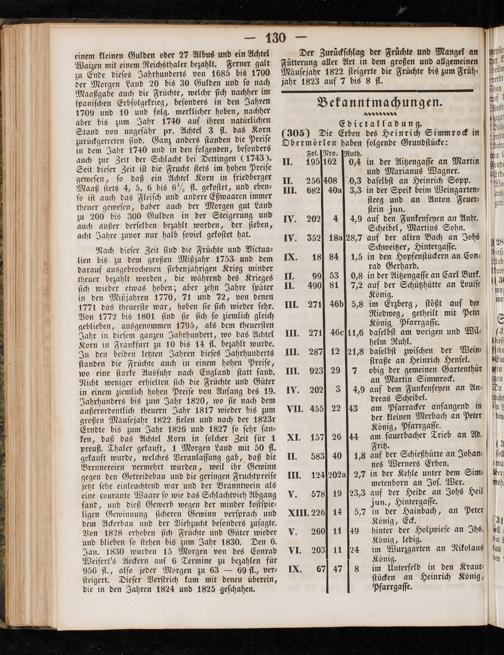 WI 1 3 angel an wee i Der Zurückſchlag der Früchte und 5 1 5 Albus und ein Achtel Art in dem großen und allgemeinen f 110 10 einem kleinen Gulden 1 bezahlt. Ferner galt a 422 ſteigerte die Früchte bis zum Fruͤh⸗ 10 4* 2„ 8* a* 5 2 1 Waizen mit einem Reich erts von 1685 bis 1700 Mäuſej 3 auf 7 bis 8 fl. 119 1 zu Ende dieſes Jahrhund Gulden und ſo nach jahr 182. deer Morgen Land 20 bis 30 iche ſich nachher im ungen get N 6 Maaßgabe auch 65 e ee in den Jahren Bekanntmachungen. 15 1 ſpaniſchen Erbfolgekrieg, f er 0 8 0 N 0 15 5 10 und folg. merklicher 1 Edictalladung. rock in 100 ö 0 aber bis zum Jahr. 15 1 das Korn(305) Die Erben des e n 00 n ih Wer ſtanden die Preiſe Obermörlen haben folgende Grundſtücke:. N zurückgetreten ſind. f onders MNro. IMuth. i 0 w ubem Saar 10 Schlacht el beugen(1488) u. 1050102 0,4 in 51 Aria ae 5 ee eit der Schlach 15 Preiſe 7 und Marianus W. 7 5 N 8 1 iſt die Frucht ſtets im e II. 256408[ 0,3 daſelbſt an Heinrich 1 055 0 ſen, ſo daß ein Achtel Korn in d eben⸗ III 2 40a 3,3 in der Speik beim Weingarten⸗ ß geweſer 1185 4, 5, 6 bis 6½ fl. gekoſtet, und 195 III. 68„ ſteeg und an Anton Feuer⸗ gal 10ů fe fle ch das Fleiſch und andere 1 and ſtein jun. Andr 6 4 10 uer geweſen, daher auch der eee 10 und 202 4 4,9 auf den Funkenfeyen a e 00 zu 200 bis 300 Gulden in der Steiger ſeben 5 Scheibel, Martins 9 155. ie% benger vererben bezahlt e 352 18 aſes,7 auf der alten Bach an Johs 2e 10 1 Jahre zuvor nur halb ſoviel gekoſtet hat. 5 N Schweitzer, 1 Con⸗ e 6 5 ö ö 7 ictua⸗ i opfenſtuckern Alb 10 Nach dieſer Zeit ſind die 7. IX. 18 84 J 1,5 i 9 8 5 10 f 1 i lien bis zu dem großen 1 8 Krieg minder 99 53[,s in der Aitzengaſſe an n 5 103 0 1 1 darauf bean den ee e des Krieges 115 6 8 72 auf der Schützhütte an Loui e N 1 700 er bezah 7 J ter f oͤnig. mei l u ele etwas hoben; aber zehn Jahre 11 18 berg, ſtößt auf den e ſich 925 70, 71 und 72, von 11 40 b 5,8 im Erzberg, ſtößt tet e in den Mißjahren 1770, ſich wieder ſehr. III. 27 Riedweg, getheilt mit Penn 8 1 N 1771 das theuerſte war, n ziemlich gleich König, Pfarrgaſſe. Wil⸗ 0 1 1 Von 1772 11 5 1 5 ae III. 271] 46611, daſelbſt 1 vorigen und Wil⸗ 16 aus f.. a e 1 dae en e Jahrhundert, wo 1 5 111 aer der Wein⸗ ichn 50 10000 Jahr n 1 10 bis 14 fl. bezahlt w 5 2871 12 21,8 vaſelbſt J inri nſel. in I A den abel liter Jahren dieſes Jahrhunderts III. ſtraße an Heim Gartenche kin 1 100095 8 eiden letz 8 f i f einen 1 0 00 anden die Früchte 5 1 ee e III. 923 297 eee 1 1 l 00;. 0 5 an„ . wo eine ſtarke Ausfuhr na die Früchte und Güter 34,9 auf dem Funkenfeyen 100 eee icht weniger erhielten ſich die a 19. IV. 202 34, eibel. 10 en genich hohen Prei ven ge dg am pfärkacer anfangen in f 1 1100 Jahrhunders bis zum Jahr 1820, e bis zum VII. 455 22 43 am kleinen Merbach an Peter din i 4 tlich theuern Jahr 1817 wiede N rgaſſe. ö 0 100800 außerordentlich ielen und nach der 18231 König, Pfarrgaſſe. Ad 9 10 großen Mäuſejahr 1 e 1827 ſo ſehr ſan⸗ XI. 157 26[44 am fauerbacher Trieb an Ad. 13 ee 0 is zum Jahr 1826 u it fi 1.. r 1000 i det Achtel ce gend mit 50 f. 40 1,8 Af der Schießhütte an Johan⸗ 1 I ußß. Thaler gekauft, 1 Morge ie II. 583. s Erben. n 00 preuß. laſſung gab, daß die 5 nes Werner iner 1000 0 irde welches Veran e 5 8 unter dem Sim⸗ ö 0 0 dan 1 unt dit Nel erco I ee en e Joſ. 05 Hel e Getreidebau und die 0 1 41 ide an Johs Hei 0 gegen den d der Branntwein als 9 23,3 auf der Hei 1 0 1 5 hr einleuchtend war un ö V. 578 1. i aſſe. i jetzt ſehr einleuch 0 f Schlachtvieh Abgang un., Hinterg 100 0 Waare ſo wie das Schlach 5 3 inbach, an Peter 000 eine courante 4 b n der minder koſtſpie⸗ 145,7 in der Hainbach, 491 1 0 N id dieß Gewerb wege 5 d XIII. 226 1. 05 1 100 ligen Gewinnung 3 uch es 4 1 Holzwieſe an Ihs. 1 1 9 dem Ackerbau und der 0 Güter wieder V. 26 König, ledig. i 100 00. f oben ſich Früchte und Gü ne Nikolaus bag Von 1828 erhoben ſich Jahr 1830. Den 6. 1 Wurzgarten an i. 11 24 im en und blieben ſo ſtehen bis zum J von des Conrad VI. 203 König. Jan. 1830 wurden 15 Morgen ü. ld in den Kraut⸗ Wefers„ 69 f,, W. 6 476 en n Heinrich König, F. 1 b 0 n 5 9.„ 120 15 Dieter Berſtich kam mit denen überein, Pfarrgaſſe. die in den Sehen 1824 und 1826 geſhahen.