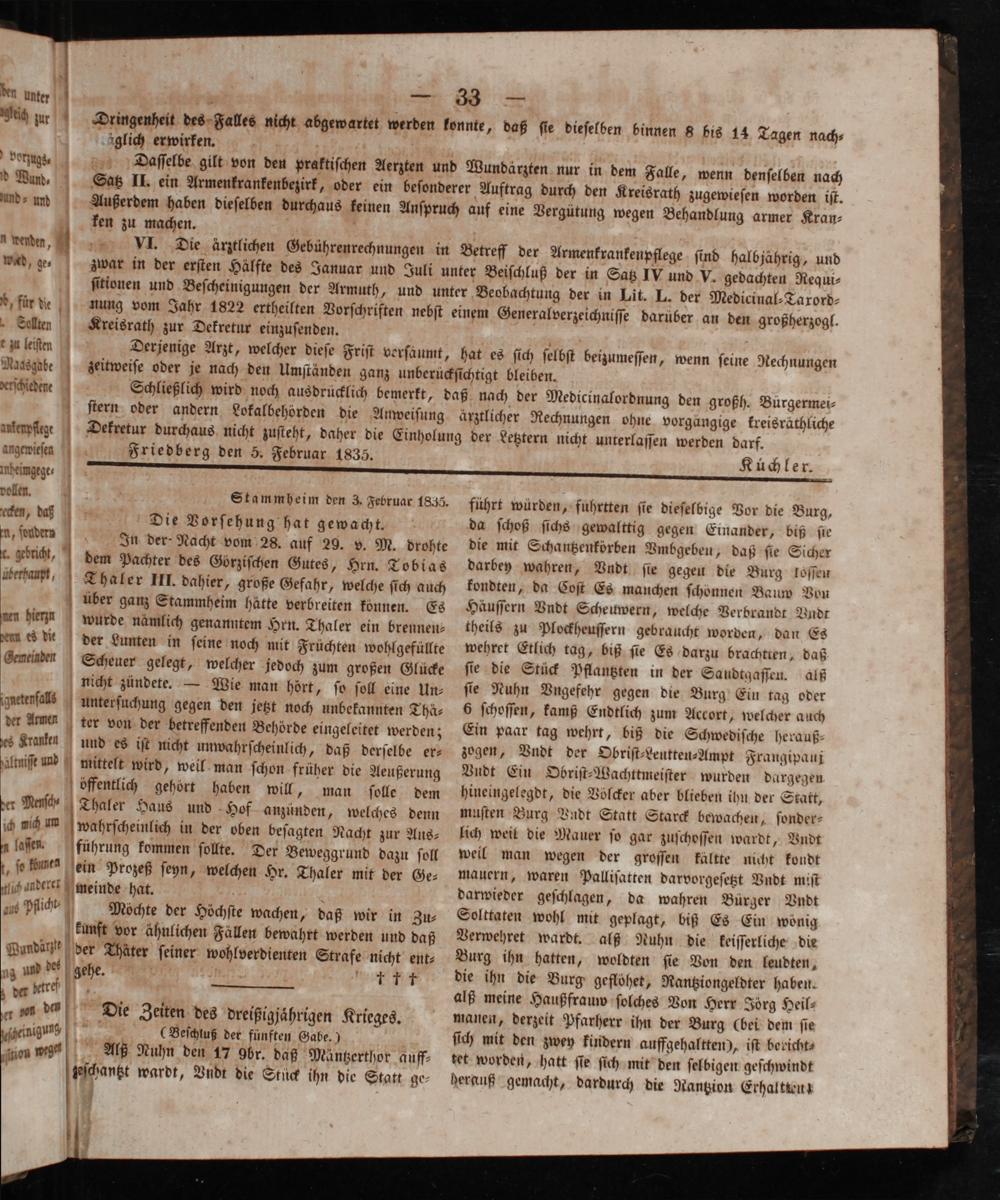 den unter s* Reg ar Dringenheit des Falles nicht abgewartet glich erwirken. a f vorzugs. Daſſelbe gilt von den pral d Wund. und⸗ und ken zu machen.. u wenden, wed, ge, zwar in der erſten Hälfte des Januar und ſitionen und Beſcheinigungen der Armuth, e für de Sellen Kreisrath zur Dekretur einzusenden. e zu leiten Derjenige Arzt, welcher dieſe Friſt verſaumt, Maasgabe zeitweiſe oder je nach den Umſtänden ganz unberück verſchiedene Schließlich wird noch ausdrücklich bemerkt, ſtern oder andern Lokalbehörden die Anweiſung arkerpftge Dekretur durchaus nicht zuſteht, daher die Einholun angewieſen Friedberg den 5. Februar 1835. mheingege ⸗ vollen. Stammheim den 3. Februar 1835. aten, daß Die Vorſehung hat gewacht. u, ſonden In der- Nacht vom 28. auf 29. v. M. drohte gebrich, dem Pachter des Goörziſchen Gutes, Hrn. Tobias lberbaurft, Thaler III. dahier, große Gefahr, welche ſich auch über ganz Stammheim hätte verbreiten können. Es ſwen hien wurde nämlich genanntem Hrn. Thaler ein brennen ies die der Lunten in ſeine noch mit Früchten wohlgefüllte Gemeinden Scheuer gelegt, welcher jedoch zum großen Glücke nicht zündete.— Wie man hört, ſo ſoll eine Un⸗ daetenſals unterſuchung gegen den jetzt noch unbekannten Thä⸗ der Armen ter von der betreffenden Behörde eingeleitet werden; es Kranken und es iſt nicht unwahrſcheinlich, daß derſelbe er—⸗ fältniſe und mittelt wird, weil man ſchon früher die Aeußerung öffentlich gehort haben will, man ſolle dem er Nac, Thaler Haus und Hof anzünden, welches denn ich nich um wahrſcheinlich in der oben beſagten Nacht zur Aus⸗ u laſen. führung kommen ſollte. Der Beweggrund dazu ſoll ſo kunt ein Prozeß ſeyn, welchen Hr. Thaler mit der Ge⸗ lit anderer meinde hat. g a ang Pfich Mochte der Höchſte wachen, daß wir in Zu⸗ kunft vor ähnlichen Fällen bewahrt werden und daß Wundäun der Thäter ſeiner wohlverdienten Strafe nicht ent⸗ ug und des gehe. 1 b WA. de bare