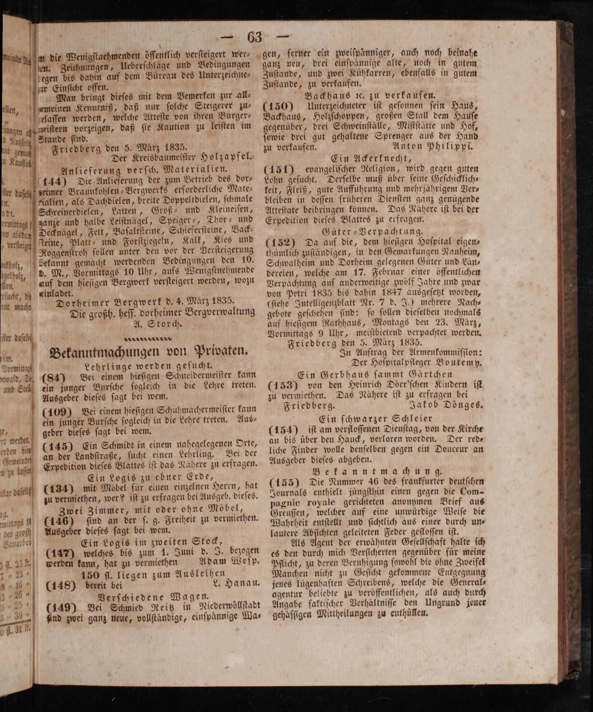 ganz neu, drei einſpännige alte, noch in gutem Zuſtande, und zwei Kühkarren, ebenfalls in gutem Zuſtande, zu verkaufen. Backhaus ꝛc. zu verkaufen. (150) Unterzeichneter iſt geſonnen ſein Haus, Backhaus, Holzſchoppen, großen Stall dem Hauſe gegenüber, drei Schweinſtälle, Miſtſtätte und Hof, ſowie drei gut gehaltene Sprenger aus der Hand zu verkaufen. Anton Philippi. Ein Ackerknecht, (151) evangeliſcher Religion, wird gegen guten Lohn geſucht. Derſelbe muß über ſeine Geſchicklich⸗ keit, Fleiß, gute Aufführung und mehrjährigem Ver⸗ bleiben in deſſen früheren Dienſten ganz genügende Atteſtate beibringen können. Das Nähere iſt bei der Expedition dieſes Blattes zu erfragen. Güter-Verpachtung. (152) Da auf die, dem hieſigen Hoſpital eigen⸗ thümlich zuſtändigen, in den Gemarkungen Nauheim, Schwalheim und Dorheim gelegenen Güter und Län⸗ dereien, welche am 17. Februar einer öffentlichen Verpachtung auf anderweitige zwölf Jahre und zwar von Petri 1835 bis dahin 1847 ausgeſetzt worden, (ſiehe Intelligenzblatt Nr. 7 d. J.) mehrere Nach⸗ gebote geſchehen ſind: ſo ſollen dieſelben nochmals auf hieſigem Rathhaus, Montags den 23. März, Vormittags 9 Uhr, meiſtbietend verpachtet werden. Friedberg den 5. März 1835. In Auftrag der Armenkommiſſion: Der Hoſpitalpfleger Boutemy. Ein Gerbhaus ſammt Gärtchen (153) von den Heinrich Dörr'ſchen Kindern iſt zu vermiethen. Das Nähere iſt zu erfragen bei Friedberg. Jakob Dönges. Ein ſchwarzer Schleier (154) iſt am verfloſſenen Dienſtag, von der Kirche an bis über den Hauck, verloren worden. Der red— liche Finder wolle denſelben gegen ein Douceur an Ausgeber dieſes abgeben.