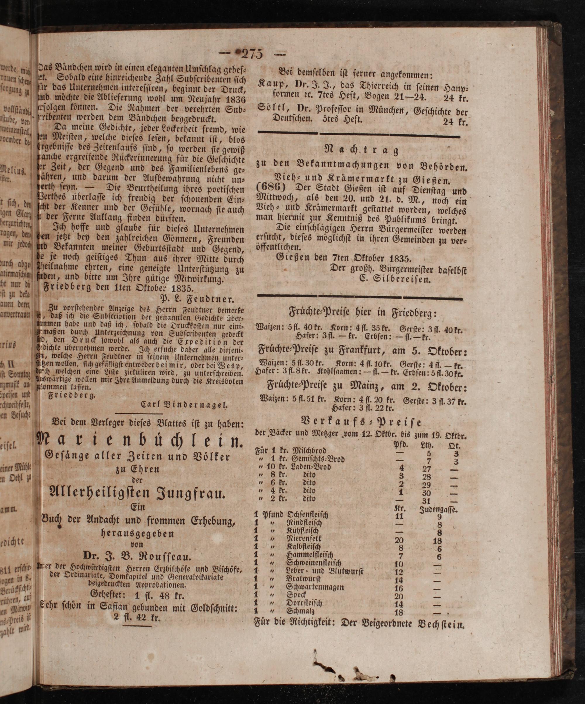 fd. Lth. Qt. Für 1 kr. Milchbrod K 5 „ 1 kr. Gemiſchts⸗Brod 7 3 „10 kr. Laden⸗Brod 27— dito 28— dito 29— dito 30— dito 31— Judengaſſe. Pfund Ochſenfleiſch. „ Rindfleiſch Kühfleiſch Nierenfett Kalbfleiſch Hammelfleiſch Schweinenfleiſch