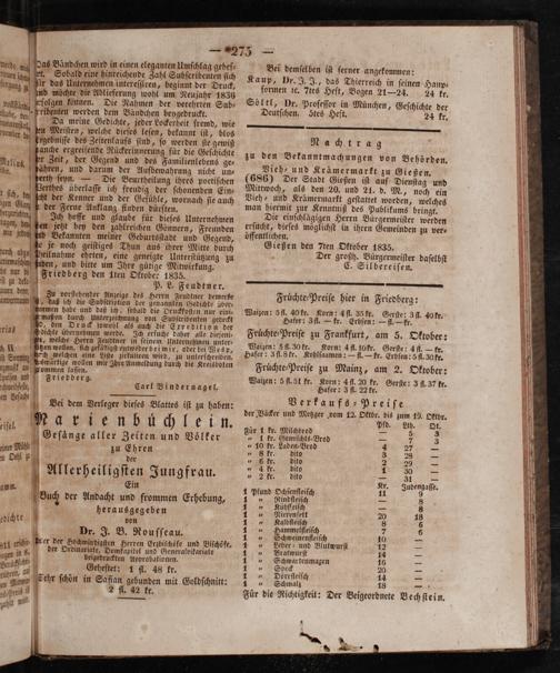 Vieh⸗ und Krämermarkt zu Gießen. (686) Der Stadt Gießen iſt auf Dienſtag und Mittwoch, als den 20. und 21. d. M.„noch ein Vieh- und Krämermarkt geſtattet worden, welches man hiermit zur Kenntniß des Publikums bringt.