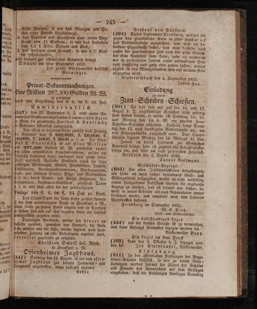Rodheim den 2. Septbr 1835. Caspar Rullmann. Geſchäfts-Anzeige. (603) um allen Irrthümlichkeiten vorzubeugen, als hätte ich mein bisher betriebenes Gold- und Silbergeſchäft aufgegeben, wollte ich nicht verfehlen, einem hochgeehrten Publikum hiervon die ergebenſte Anzeige zu machen, daß ich ſolches wie früher, ſo⸗ wohl in neuen Arbeiten als auch Reparaturen immer fortſetzen werde, und empfehle mich dem früheren Wohlwollen beßtens. Friedberg im September 1835. W. E. Dietz, Gold- und Silberarbeiter. Ein vollſtändiges Logis (534) auf der breiten Straße iſt zu vermiethen, und kann Anfangs November bezogen werden bei Bäckermeiſter Bopp. Ein Logis im Z3ten Stock kann den 3. Oktober d. J. bezogen wer⸗ Joh Steinhäußer, Bäckermeiſter. Einladung. (611) Zu den 195905 Prüfungen der ſtiner⸗Schüler hieſelbſt, ſo wie zu deren Rede— Uebungen werden hiermit die Eltern der Schüler und Freunde des Unterrichtes mit dem Beifügen eingeladen, daß die Prüfungen künftigen Samstag