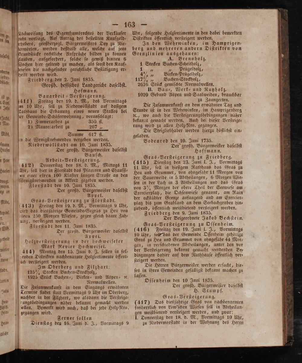 n riefen die nachgeſuchte gerichtliche Beſtätigung er— ieder heilt werden wird. l Mach Friedberg den 2. Juni 1835. 1 Großh. heſſiſches Landgericht daſelbſt. Hofmann. in ge 5 Bauarbeit-Verſteigerung. f en 411) Freitag den 19. d. M., des Vormittags e, im 10 Uhr, ſoll zu Niederwöllſtadt auf daſigem * kathhaus die Erbauung eines neuen Stalles bei Je. er Gemeinde⸗Schäferwohnung, voranſchlagt: Nr., 10 Zimmerarbeit zu 350 fl. g 2) Maurerarbeit zu„ Mob, Summe 617 fl. 5 in die Wenigſtnehmenden vergeben werden. mam Niederwoͤllſtadt am 10. Juni 1835. Haaſen Der großh. n daſelbſt a Jauſch. ü n Arbeit⸗Verſteigerung. 412) Donnerſtag den 18. d. M., Mittags 11 Haaſen 0 Ahr, ſoll hier in Florſtadt das Plauiren und Chauſſi⸗ den einer circa 100 Klafter langen Straße an den dog. Wenigſtnehmenden in Akkord gegeben werden. mann. 1 Florſtadt den 10. Juni 1835. * a 1 Der großh. Bürgermeiſter daſelbſt Appel, Mibes, Gras⸗Verſteigerung zu Florſtadt. (413) Freitag den 19. d. M., Vormittags 9 Uhr, ln, ird das diesjährige Gemeinde⸗Gegräs zu Hen von 1 iren 250 Morgen Wieſen, gegen gleich baare Zah⸗ f. Aung, verſteigert werden. 010 Floörſtadt den 11. Juni 1835. 4 Der großh. Bürgermeiſter daſelbſt aachen 1 e 0 Appel. * Holzverſteigerung in der hochweiſeler 1 11 Mark Revier Hochweiſel. 1411 0 414) Montag den 15. Juni d. J. ſollen in fol⸗ 7 1 enden Diſtrikten nachbenannte Holzſortimente öffent— a ſch verſteigert werden. i Im Oberberg und Filzhart: r. 125% Stecken Buchen⸗Stockholz, 1925 Stück Buchen⸗, Birken⸗ und Aspen ꝛc. rin f Normalwellen. Die Zuſammenkunft in dem Eingangs erwähnten Johs Termine findet ſtatt Vormittags 9 Uhr im Oberberg, nachher in der Filzhart, wo alsdann die Verſteige⸗