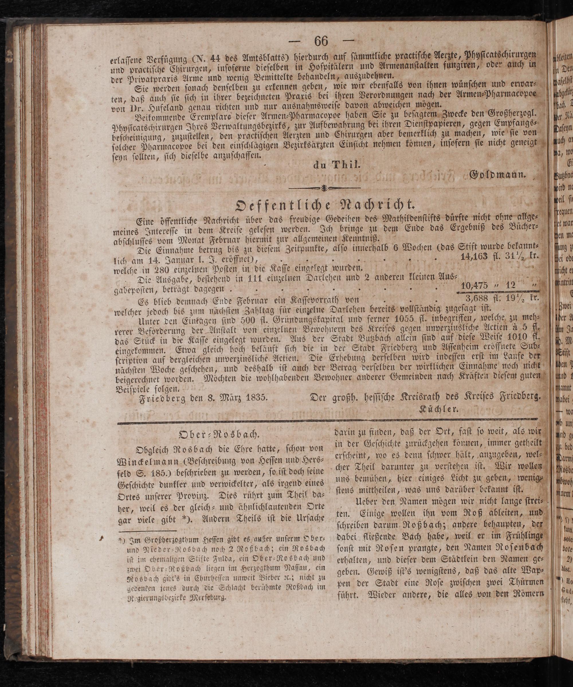 5. Soldmann. Subar Oeffentliche Nachricht. e Eine öffentliche Nachricht über das freudige Gedeihen des Mathildenſtifts dürfte nicht ohne allge⸗ meines Intereſſe in dem Kreiſe geleſen werden. Ich bringe zu dem Ende das Ergebniß des Bücher⸗ abſchluſſes vom Monat Februar hiermit zur allgemeinen Kenntniß. b Die Einnahme betrug bis zu dieſem Zeitpunkte, alſo innerhalb 6 Wochen(das Stift wurde bekannt 0 lich am 14. Januar l. J. eröffnet), 0 45 ö.„ 14,163 fl. 31% kr 17 welche in 280 einzelnen Poſten in die Kaſſe eingelegt wurden.%%% ͤ( Die Ausgabe, beſtehend in 111 einzelnen Darlehen und 2 anderen kleinen Aus⸗ 7 5 gabepoſten, beträgt dagegen a 5 8 5 FCC ntrit Es blieb demnach Ende Februar ein Kaſſevorrath von 8 5 3,688 fl. 19% k welcher jedoch bis zum nächſten Zahltag für einzelne Darlehen bereits vollſtändig zugeſagt iſt.. i Unter den Einkagen ſind 500 fl. Gründungskapital und ferner 1055 fl. inbegriffen, welche zu meh er 2 rerer Beförderung der Anſtalt von einzelnen Bewohnern des Kreiſes gegen unverzinsliche Actien à 5. das Stuck in die Kaſſe eingelegt wurden. Aus der Stadt Butzbach allein ſind auf dieſe Weiſe 1010 9 eingekommen. Etwa gleich hoch beläuft ſich die in der Stadt Friedberg und Aſſenheim eröffnete Sub⸗ ſeription auf dergleichen unverzinsliche Actien. Die Erhebung derſelben wird indeſſen erſt im Laufe der nächſten Woche geſchehen, und deshalb iſt auch der Betrag derſelben der wirklichen Einnahme noch nicht beigerechnet worden. Möchten die wohlhabenden Bewohner anderer Gemeinden nach Kräften dieſem guten Beiſpiele folgen. i i b Friedberg den 8. März 1835. Der großh. heſſiſche Kreisrath des Kreiſes Friedberg, abel