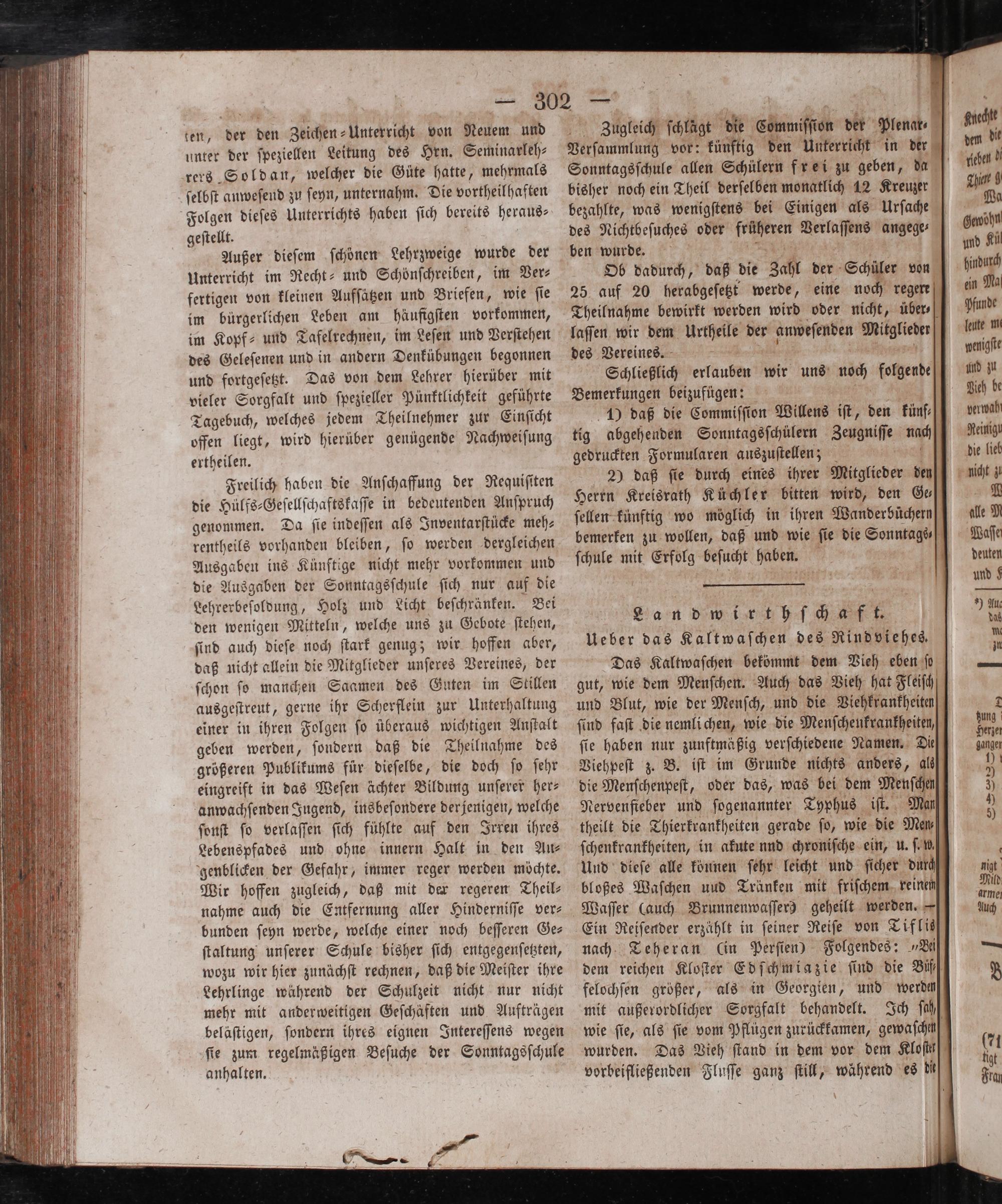 Ueber das Kaltwaſchen des Rindviehes. Das Kaltwaſchen bekömmt dem Vieh eben ſo gut, wie dem Menſchen. Auch das Vieh hat Fleiſch und Blut, wie der Menſch, und die Viehkrankheiten ſind faſt die nemli chen, wie die Menſchenkrankheiten ſie haben nur zunftmäßig verſchiedene Namen. Die Viehpeſt z. B. iſt im Grunde nichts anders, als die Menſchenpeſt, oder das, was bei dem Menſeh en Nervenſieber und ſogenannter Typhus iſt. Man theilt die Thierkrankheiten gerade ſo, wie die Men,