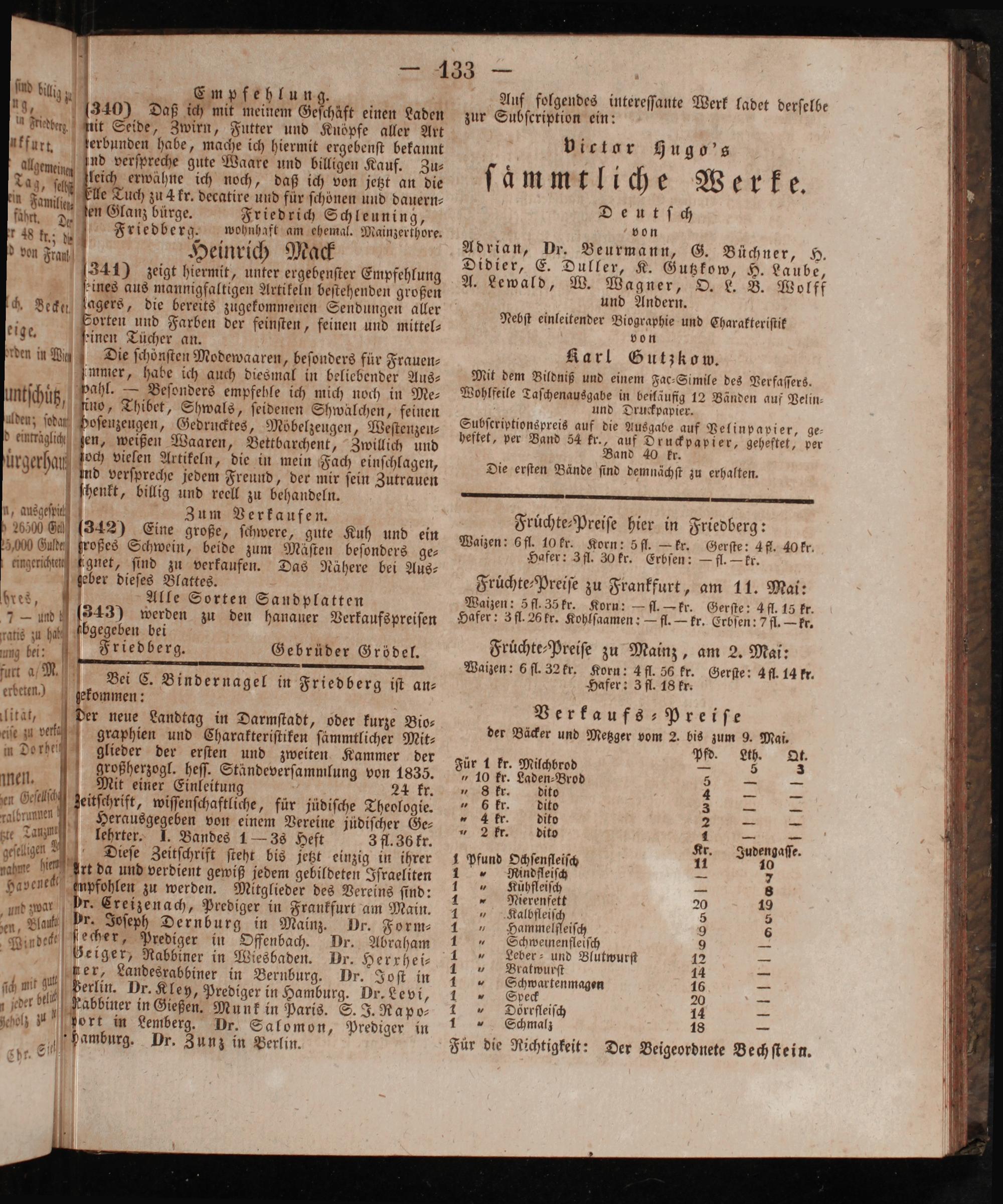 ſud bilig N Empfehlung. * 340) Daß ich mit meinem Geſchäft einen Laden tit Seide, Zwirn, Futter und Knöpfe aller Art erbunden habe, mache ich hiermit ergebenſt bekannt ind verſpreche gute Waare und billigen Kauf. Zu⸗ leich erwähne ich noch, daß ich von jetzt an die Elle Tuch zu 4 kr. decatire und für ſchönen und dauern⸗ en Glanz bürge. Friedrich Schleuning, Friedberg. wohnhaft am ehemal. Mainzerthore. Heinrich Mack 341) zeigt hiermit, unter ergebenſter Empfehlung eines aus mannigfaltigen Artikeln beſtehenden großen agers, die bereits zugekommenen Sendungen aller i Zorten und Farben der feinſten, feinen und mittel⸗ eige. feinen Tücher an. erden in Wig Die ſchoͤnſten Modewaaren, beſonders für Frauen⸗ Immer, habe ich auch diesmal in beliebender Aus— untſchütz pahl.— Beſonders empfehle ich mich noch in Me⸗ fino, Thibet, Shwals, ſeidenen Shwalchen, feinen lden; ſodar oſenzeugen, Gedrucktes, Möbelzeugen, Weſtenzeu⸗ d einträglich.