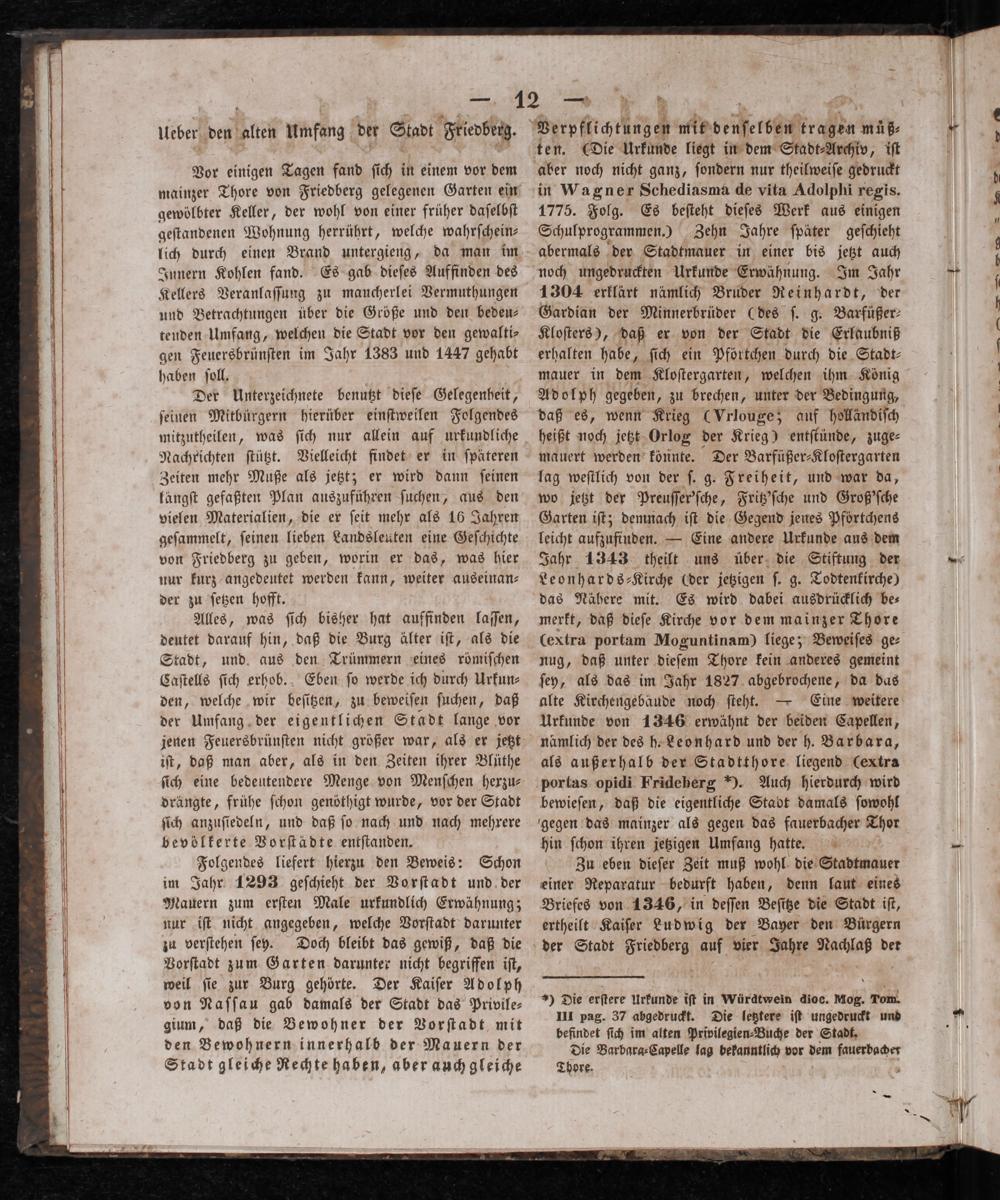 Verpflichtungen mit denſelben tragen müß⸗ ten.(Die Urkunde liegt in dem Stadt⸗Archiv, iſt aber noch nicht ganz, ſondern nur theilweiſe gedruckt in Wagner Schediasma de vita Adolphi regis. 1775. Folg. Es beſteht dieſes Werk aus einigen Schulprogrammen.) Zehn Jahre ſpäter geſchieht abermals der Stadtmauer in einer bis jetzt auch noch ungedruckten Urkunde Erwähnung. Im Jahr 1304 erklärt nämlich Bruder Reinhardt, der Gardian der Minnerbrüder(des ſ. g. Barfüßer⸗ Kloſters), daß er von der Stadt die Erlaubniß erhalten habe, ſich ein Pförtchen durch die Stadt⸗ mauer in dem Kloſtergarten, welchen ihm König Adolph gegeben, zu brechen, unter der Bedingung, daß es, wenn Krieg(Vrlouge; auf holländiſch heißt noch jetzt Orlog der Krieg) entſtünde, zuge⸗ mauert werden könnte. Der Barfüßer⸗Kloſtergarten lag weſtlich von der ſ. g. Freiheit, und war da, wo jetzt der Preuſſer'ſche, Fritz'ſche und Groß'ſche Garten iſt; demnach iſt die Gegend jenes Pförtchens leicht aufzufinden.— Eine andere Urkunde aus dem Jahr 1343 theilt uns über die Stiftung der Leonhards Kirche(der jetzigen ſ. g. Todtenkirche) das Nähere mit. Es wird dabei ausdrücklich be⸗ merkt, daß dieſe Kirche vor dem mainzer Thore (extra portam Moguntinam) liege; Beweiſes ge⸗ nug, daß unter dieſem Thore kein anderes gemeint ſey, als das im Jahr 1827 abgebrochene, da das alte Kirchengebaude noch ſteht.— Eine weitere Urkunde von 1346 erwähnt der beiden Capellen, nämlich der des h. Leonhard und der h. Barbara, als außerhalb der Stadtthore liegend(extra portas opidi Frideberg). Auch hierdurch wird bewieſen, daß die eigentliche Stadt damals ſowohl gegen das mainzer als gegen das fauerbacher Thor hin ſchon ihren jetzigen Umfang hatte.— Zu eben dieſer Zeit muß wohl die Stadtmauer einer Reparatur bedurft haben, denn laut eines Briefes von 1346, in deſſen Beſitze die Stadt iſt, ertheilt Kaiſer Ludwig der Bayer den Bürgern der Stadt Friedberg auf vier Jahre Nachlaß der