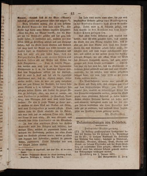 Aus allen dieſen Urkunden geht deutlich das hervor, was ich oben geäußert habe, daß nämlich die Stadt ihre alte Gränze behalten habe, daß ſie aber zur Zeit ihrer Blüthe nach ihren drei Haupt— thoren hin noch Vorſtadte gehabt haben müſſe, die indeſſen nach und nach immer unbedeutender wur⸗ den, und endlich in den wilden Zeiten des dreißig— jährigen Krieges, wo alle offene Platze der Wuth des Kriegers blosgeſtellt waren, faſt ganz unter⸗ giengen und deren Häuſer verbrannten.— Schließ⸗ lich füge ich hier noch bei, daß die Stadtmauer in früheren Zeiten unbedeckt war und laut einer Chronik— nachricht, die ich indeſſen nicht weiter urkundlich belegen kann, erſt vom Jahr 1578 an mit etuem Dache verſehen wurde.