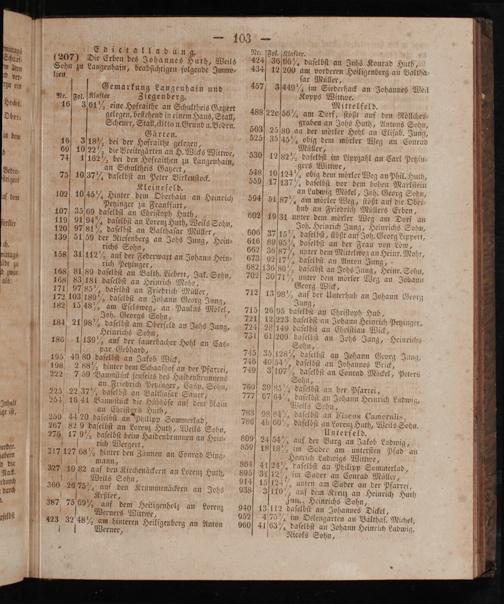 Gärten. 318 ½ bei der Hofraithe gelegen, 659 10,22% die Breitegärten an H. Wicks Wittwe, 10162% bei den Hofraithen zu Langenhain, an Schultheis Gatzert, 10 37¼ daſelbſt an Peter Birkenſtock. Kleinefeld.