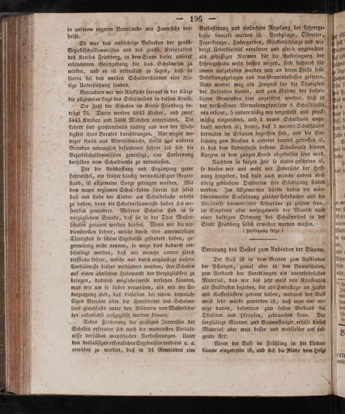 Für die Anſchaffung und Ergänzung guter Lehrmittel, ein früher häufig vernachläßigter Gegen⸗ ſtand, iſt allgemeine Sorge getragen worden. Mit dem neuen regſamen Schul-Leben ſcheint ſich ſelbſt Luſt und Liebe der Kinder am Schulbeſuche erhöht zu haben; denn die Schulverſäumniſſe haben ſich we— ſentlich gemindert. Mehrere Schulen ſind in ſo vorzüglichem Stande, daß ſie in der That Muſter⸗ ſchulen genannt werden dürfen. Wenn wir die ver⸗ dienſtvollen Lehrer, welche durch ihre unermüdliche Thätigkeit ſo ſchöne Ergebniſſe gefördert haben, ge— genwärtig nicht nennen, ſo möge dies dadurch ent⸗ ſchuldigt werden, daß wir manche andere gleich treffliche Lehrer, welche nur durch ungünſtige äußere Verhältniſſe bisher verhindert wurden, ihre Schulen auf einen ähnlichen Höhepunkt der Vorzüglichkeit zu bringen, dadurch möglicherweiſe verletzen könnten, was wir um ſo lieber vermeiden, als wir der Ue⸗ berzeugung ſind, daß dieſelben bei einem demnäch⸗ ſtigen Berichte über die Fortſchritte des Schulwe⸗ ſens gleichfalls unter den Bildnern von Muſterſchu⸗ len rühmlichſt aufgezählt werden können.