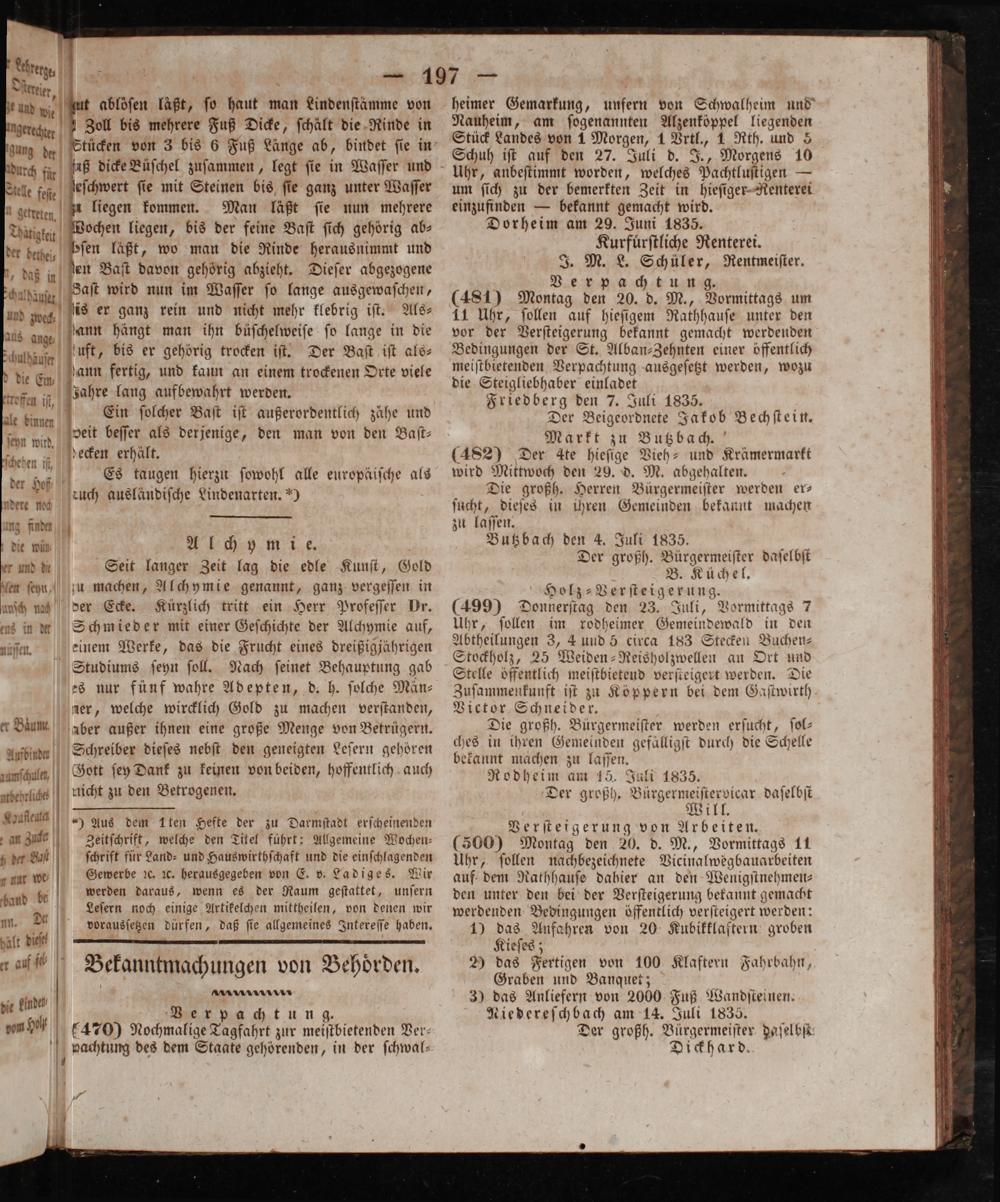 Digi Bochen liegen, bis der feine Baſt ſich gehörig ab⸗ der bethei ſen läßt, wo man die Rinde herausnimmt und b, daß in den Baſt davon gehörig abzieht. Dieſer abgezogene Huh Saſt wird nun im Waſſer ſo lange ausgewaſchen, und mec, is er ganz rein und nicht mehr klebrig iſt. f Als⸗ aus ang ann hängt man ihn büſchelweiſe ſo lange in die gulhäuſe luft, bis er gehörig trocken iſt. Der Baſt iſt als⸗ o die En, ann fertig, und kaun an einem trockenen Orte viele froffe il Jahre lang aufbewahrt werden. Kn ö Ein ſolcher Baſt iſt außerordentlich zaͤhe und ſchn wütd veit beſſer als derjenige, den man von den Baſt⸗ ſchehen it, Ei. 21 in Es taugen hierzu ſowohl alle europäiſche als 8 duch ausländiſche Lindenarten.“) ung fing die wüß ene er und de Seit langer Zeit lag die edle Kunſt, Gold (len ſehu, zu machen, Alchymie genannt, ganz vergeſſen in unſsch nah der Ecke. Kürzlich tritt ein Herr Profeſſer Dr. ens in r Schmieder mit einer Geſchichte der Alchymie auf, nüſſen. einem Werke, das die Frucht eines dreißigjährigen Studiums ſeyn ſoll. Nach ſeinet Behauptung gab es nur fünf wahre Adepten, d. h. ſolche Män⸗ er, welche wircklich Gold zu machen verſtanden, t Bum aber außer ihnen eine große Menge von Betrügern. Aubing. Schreiber dieſes nebſt den geneigten Leſern gehören unſchln. Gott ſey Dank zu keinen von beiden, hoffentlich auch