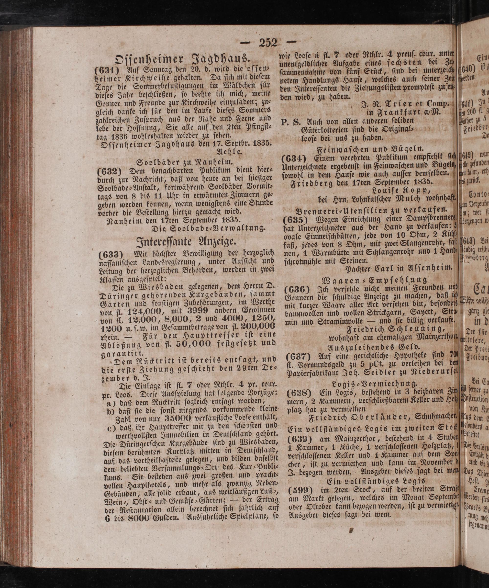 Intereſſante Anzeige. (633) Mit höchſter Bewilligung der herzoglich naſſauiſchen Landesregierung, unter Aufſicht und Leitung der herzoglichen Behörden, werden in zwei Klaſſen ausgeſpielt: Die zu Wiesbaden gelegenen, dem Herrn D. Düringer gehörenden Kurgebäuden, ſammt Gärten und ſonſtigen Zubehörungen, im Werthe von fl. 124,000, mit 3999 andern Gewinnen von fl. 12,000, 8,000, 2 und 4000, 1250, 1200 u. ſ. w. im Geſammtbetrage von fl. 200,000 rhein.— Für den Haupttreffer iſt eine Ablößung von fl. 50,000 feſtgeſetzt und garantirt. Dem Rücktritt iſt bereits entſagt, und die erſte Ziehung geſchieht den 29ten De⸗ zember d. J. Die Einlage iſt fl. 7 oder Rthlr. 4 pr. cour. pr. Loos. Dieſe Ausſpielung hat folgende Vorzüge: a) daß dem Rücktritt ſogleich entſagt worden, p) daß ſie die ſonſt nirgends vorkommende kleine Zahl von nur 35000 verkäufliche Looſe enthält, c) daß ihr Haupttreffer mit zu den ſchönſten und