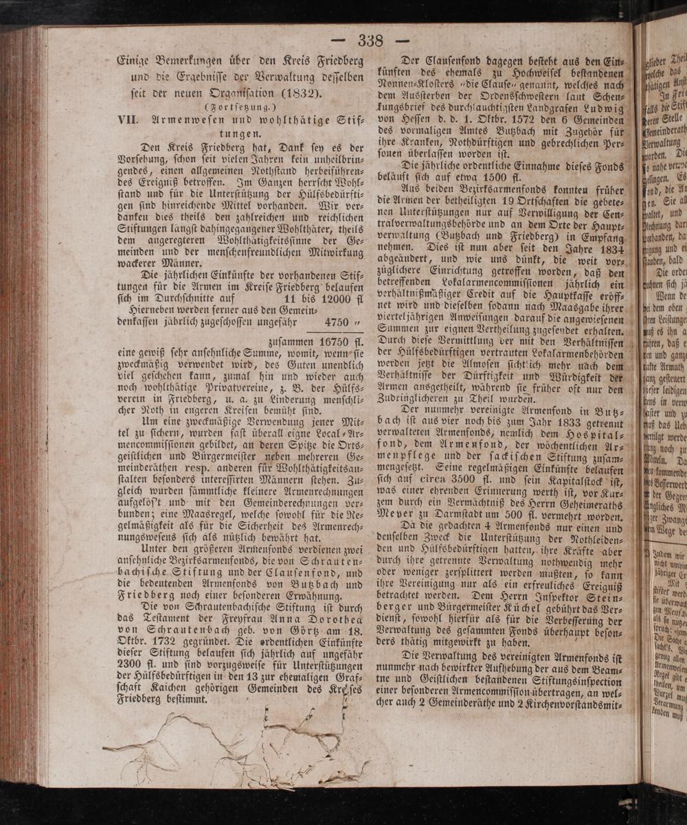 Unter den größeren Armenfonds verdienen zwei anſehnliche Bezirksarmenfonds, die von Schrauten— bachiſche Stiftung und der Clauſenfond, und die bedeutenden Armenfonds von Butzbach und Friedberg noch einer beſonderen Erwähnung.