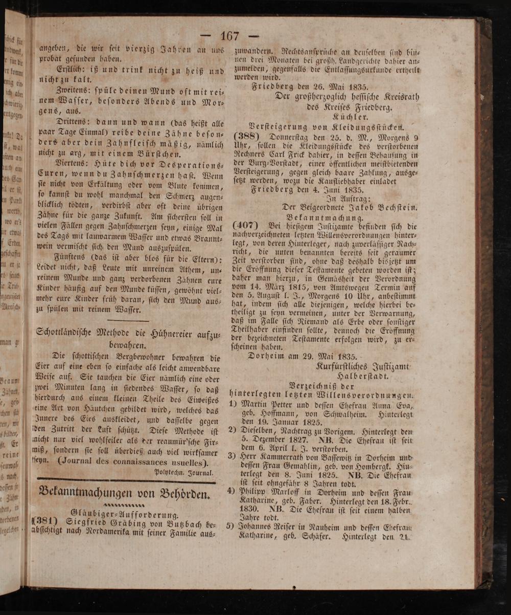 Friedberg den 4. Juni 1835. In Auftrag:. Der Beigeordnete Jakob Bechſtein. Bekanntmachung. b