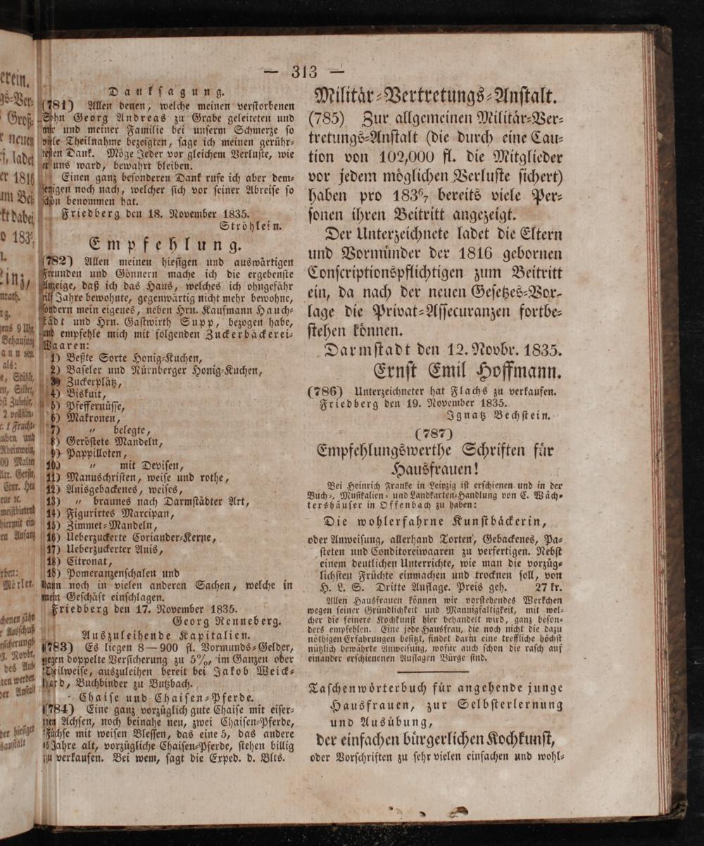 Mo tlet, hann noch in vielen anderen Sachen, welche in mein Geſchäft einſchlagen. 4 Friedberg den 17. November 1835. genen fie 1 Georg Renneberg. r hn Auszuleihende Kapitalien.