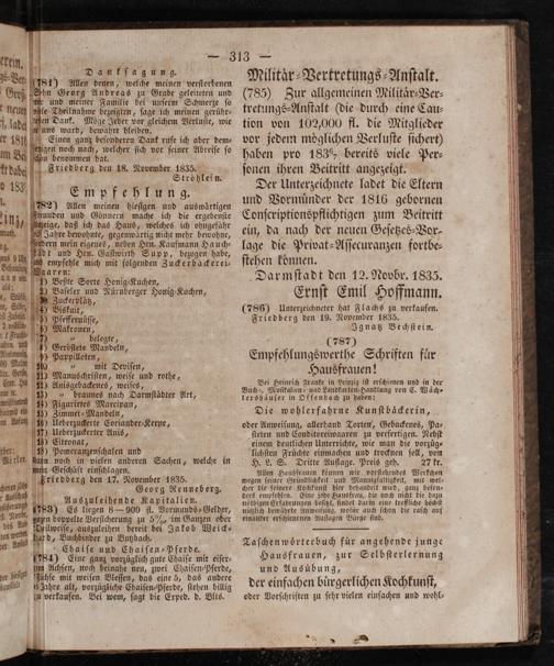 Militaͤr⸗Vertretungs-Anſtalt. (785) Zur allgemeinen Militaͤr-Ver⸗ tretungs-Anſtalt(die durch eine Cau— tion von 102,000 fl. die Mitglieder vor jedem moͤglichen Verluſte ſichert) haben pro 1835, bereits viele Per⸗ ſonen ihren Beitritt angezeigt.