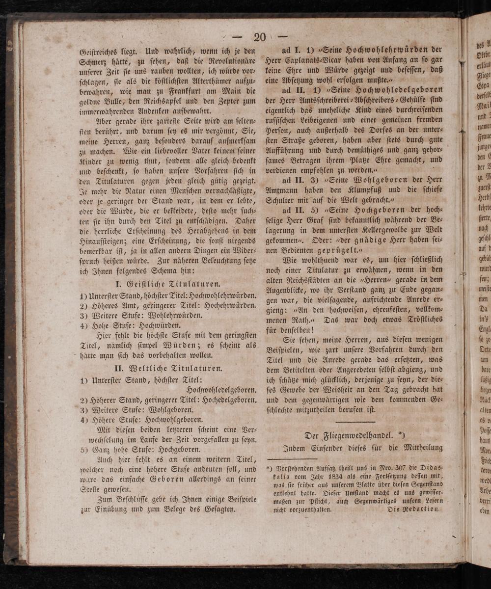 I. Geiſtliche Titulaturen. 1) Unterſter Stand, höchſter Titel: Hochwohlehrwuͤrden. 2) Höheres Amt, geringerer Titel: Hochehrwürden. 3) Weitere Stufe: Wohlehrwürden. 4) Hohe Stufe: Hochwürden. Hier fehlt die höchſte Stufe mit dem geringſten Titel, nämlich ſimpel Würden; es ſcheint als