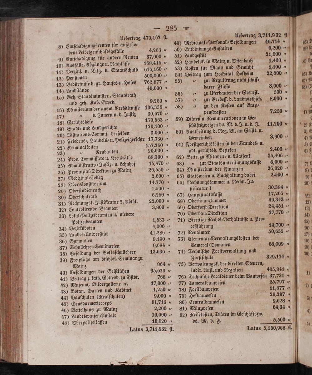 .„ Uebertrag 479,162 fl. 7 i uobertrag 3,711,932 fl 8) Entſchädigungsrenten fr aufgeho⸗ 49) Medicinal⸗Perſonal⸗Beſoldungen 46%14, bene Leibeigenſchaftsgefaͤlle 4,263 50) Entbindungs⸗Anſtalten 0 6,200„1 31 9) Entſchädigung für andere Renten 37,000 51) Landgeſtüt 5 21,000„ 1 10) Ausfälle, Abgänge u. Nachläſſe„ en 52) Handelsk. in Mainz u. Offenbach 1,400 11) Verzinſ. u. Tilg. d. Staatsſchuld 616,160„ 53) Koſten für Maas und Gewicht 1,100„ 1 Penſionen 500,000 54) Beitrag zum Hospital Hofheim 22,500- 13) Bedürfniſſe d. gr. Hauſes u. Hofes 762,877 550„ zur Regulirung nicht ſchiff⸗„ 140 Landſtände 40,000 995 barer Flüſſe a 3,000„ 15) Geh. Staatsminiſter., Staatsrath 56)„ zz Uferbauten der Grenzfl. 500„ und geh. Kab. Exped. 5 9,260 57)„ zur Verbeſſ. d. Laudwirthſch. 8,000„ 16) Miniſterium der ausw. Verhältniſſe 106,356 589„ zu den Koſten auf Etap⸗ 1 17 1 d. Innern u. d. Juſtiz 30,670 4 penſtraßen 7,250 18) Gerichtshoͤfe i 170,563 59) Diäten u. Remunerationen in Ge⸗⸗ f 19) Stadt⸗ und Landgerichte 120,100 ſchäftszweigen ds. M. d. J. u. d. J. 11,200„ 20) Viſitations⸗Commiſ. derſellpfen 3,000„ 60) Austheilung d. Reg. Bl. an Geiſtl. u.. 21) Friedens, Handels- u. Polizeigerichte 17,730„ Gemeinden 3,900„ 220 Kriminalkoſten 157,260„ 61) Forſtgetichtskoſten in den Standes⸗ u. 1 23) 1 Neubauten 20,00 adl. gerichtsh. Bezirken 2j,4⁰⁰ 24) Prov. Commiſſäre u. Kreisräthe 68,300 62) Beitr. zu Wittwen⸗ u. Waiſenk. 36,496„ 25) Adminiſtrativ⸗Juſtiz⸗ u. Lehnhof 15,470 63)„ Nzur Staatsunterſtützungskaſſe 6,000- 20) Provinzial⸗Direktion zu Mainz 26,550 64) Miniſterium der Finanzen 26,020 7) Medizinal⸗Colleg 2,600 65) Etatsweſen u. Buchhaltung dabei 2,500„ 28) Ober⸗Conſiſtorium 14,770 66) Rechnungskammer u. Rechn. u- 29) Oberſtudienrath 1,500 ſtificatur! 84 30) Oderſchulrath 6,250 67) Hauptſtaatskaſſe a 17,265„%„j 31) Rechnungsk. Juſtiſicatur 2. Abthl. 22,000 68) Oberfinanzkammer g ö 49,343„ 30 Controlirende Beamten 3,800 69) Oberforſt⸗Direktion 24,451 33) Lokal⸗Polizeibeamten u. niedere 70) Oberbau⸗Direktion ö 17,770 ͤ k Polizeibeamten 1,533 71) Streitige Rechts⸗Verhältniſſe f. Pros, 34) Bezirksboten 4,000 ceßführung 14,700„ 35) Landes⸗Univerſitt 10 41,286 72) Rentämter 50,655„ 36) Gymnaſien 9,190„ 73) Elementar⸗Verwaltungskoſten der 9 37) Schullehrer⸗Seminarien 9,684„ Cameral⸗Domänen 658,009„ 38) Beſoldung der Volksschullehrer 13,536, 70) Techniſche Forſtverwaltung und 7 555 39) Freiplätze am biſchöfl. Seminar zu a Forſtſchule 1 329,174 Mainz. 964 75) Verwaltungsk. der direkten Steuern, i 40) Beſoldungen der Geiſtlichen 95,629„ indir. Aufl. und Regalien 495,841 41) Beitrag z. kath. Gottesd. zu Dſtdt. 768„ 76) Techniſche Localdiener beim Bauweſen 37,731, N 42) Muſeum, Bildergallerie vc. 17,000„ 77) Cameralbauweſen 25,7907„ 43) Botan. Garten und Kabinet 1,250„ 78) Forſtbauweſen„ 44) Bauſchulen(Realſchulen) 9000„ 79) Hofbauweſen 200,297„ 45) Gensdarmeriecorps 81,716„ 80) Centralbauweſen 6 9,628„ 46) Bettelhaus zu Mainz 2,200„ 81) Münzweſen 8 64,34% 47) Landeswaiſen⸗Anſtalt 10,000, 82) Reiſekoſten, Diäten im Geſchaftszw. 48) Oberpolizeikaſſen l 10,020„ ds. M. d. F. ö 8