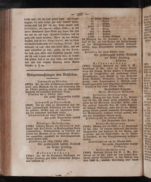 Jahrmarkt zu Okarben. f (675) Der für 1835 zu Okarben zu haltende Jahr⸗ markt wird Mittwoch den 28. und Donnerſtag den 29. Oktober gehalten, welches man zur allgemeinen Kenntniß des handelnden Publikums bringt. Okarben den 6. Oktober 1835. Der großh. Bürgermeiſter daſelbſt Bieber. Jahrmarkt zu Oberrosbach. (689) Der für 1835 zu Oberrosbach ſtatt fin⸗ dende Jahrmarkt wird Donnerſtag den öten Novem⸗ ber gehalten, welches man zur allgemeinen Kennt⸗ niß des handelnden Publikums bringt. Oberrosbach am 14ten Oktober 1835. Der großh. Bürgermeiſter daſelbſt Lämmer.
