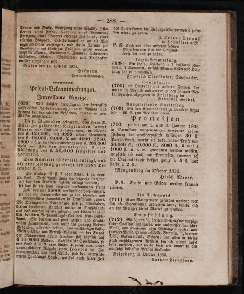 (710 zu der am 2. und 3. Januar 1836 in Darmſtadt vorgenommen werdende zehnte Ziehung der großherzoglich heſſiſchen 30 fl. Partial⸗Looſe, worin die bedeutenden Preiſe von 50,000 fl., 10,000 fl., 5000 fl., 6 mal& 1000 fl. u. ſ. w. gewonnen werden muͤſſen, empfehle ich mich mit Promeſſen,(wovon ich die Original⸗Looſe beſitze) ganze à 4 fl. und halbe à 2 fl. Muͤnzenberg im Oktober 1835.