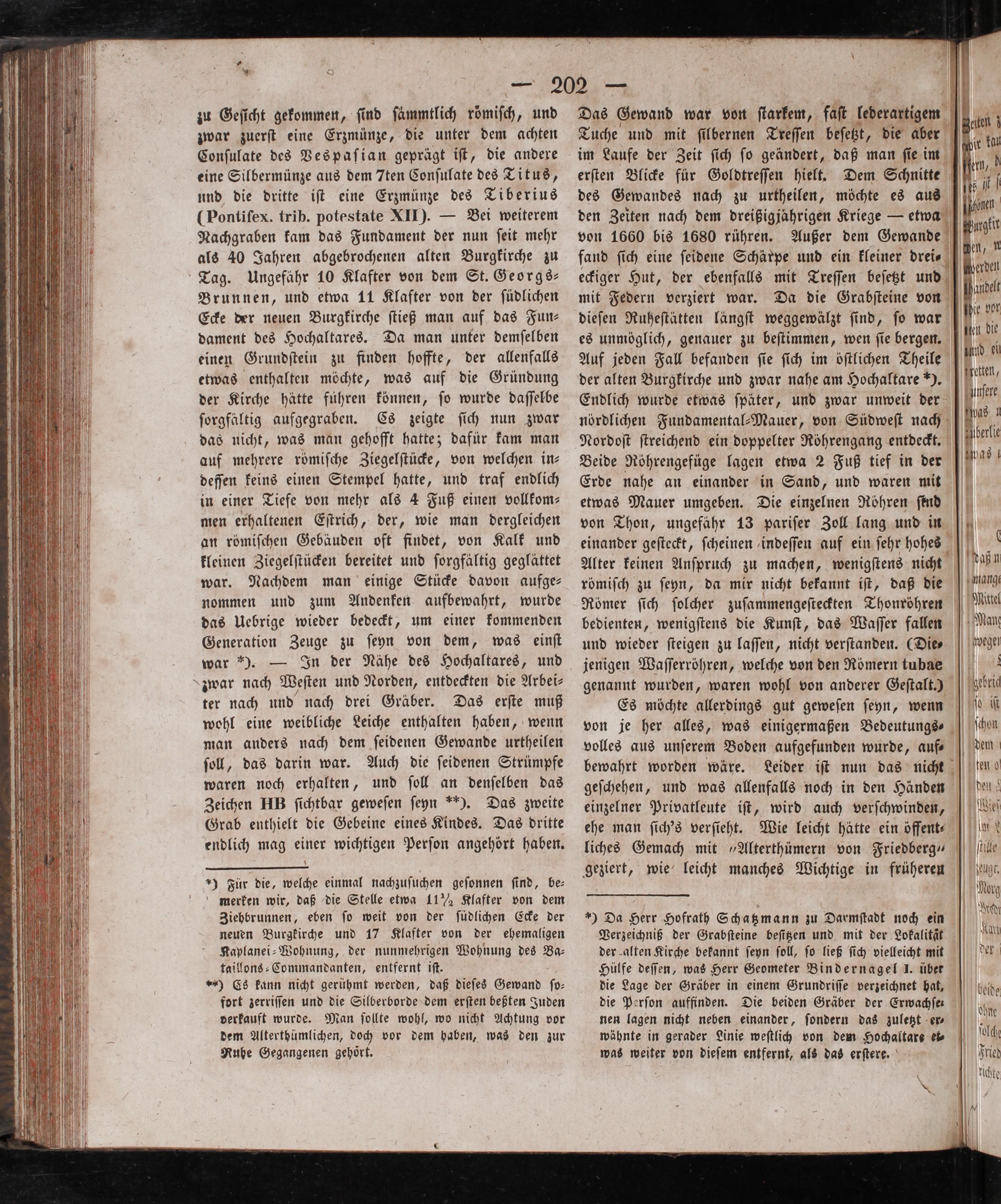 zu Geſicht gekommen, ſind ſammtlich röͤmiſch, und zwar zuerſt eine Erzmünze, die unter dem achten Conſulate des Vespaſian geprägt iſt, die andere eine Silbermünze aus dem 7ten Conſulate des Titus, und die dritte iſt eine Erzmünze des Tiberius (Pontiſex. trib. potestate XII).— Bei weiterem Nachgraben kam das Fundament der nun ſeit mehr als 40 Jahren abgebrochenen alten Burgkirche zu Tag. Ungefähr 10 Klafter von dem St. Georgs— Brunnen, und etwa 11 Klafter von der ſüdlichen Ecke der neuen Burgkirche ſtieß man auf das Fun⸗ dament des Hochaltares. Da man unter demſelben einen Grundſtein zu finden hoffte, der allenfalls etwas enthalten möchte, was auf die Gründung der Kirche hatte fuͤhren können, ſo wurde daſſelbe ſorgfältig aufgegraben. Cs zeigte ſich nun zwar das nicht, was man gehofft hatte; dafür kam man auf mehrere römiſche Ziegelſtücke, von welchen in— deſſen keins einen Stempel hatte, und traf endlich in einer Tiefe von mehr als 4 Fuß einen vollkom⸗ men erhaltenen Eſtrich, der, wie man dergleichen an römiſchen Gebäuden oft findet, von Kalk und kleinen Ziegelſtücken bereitet und ſorgfältig geglättet war. Nachdem man einige Stücke davon aufge- nommen und zum Andenken aufbewahrt, wurde das Uebrige wieder bedeckt, um einer kommenden Generation Zeuge zu ſeyn von dem, was einſt war).— In der Nähe des Hochaltares, und zwar nach Weſten und Norden, entdeckten die Arbei⸗ ter nach und nach drei Gräber. Das erſte muß wohl eine weibliche Leiche enthalten haben, wenn man anders nach dem ſeidenen Gewande urtheilen ſoll, das darin war. Auch die ſeidenen Strümpfe waren noch erhalten, und ſoll an denſelben das Zeichen HB ſichtbar geweſen ſeyn*). Das zweite Grab enthielt die Gebeine eines Kindes. Das dritte endlich mag einer wichtigen Perſon angehört haben.
