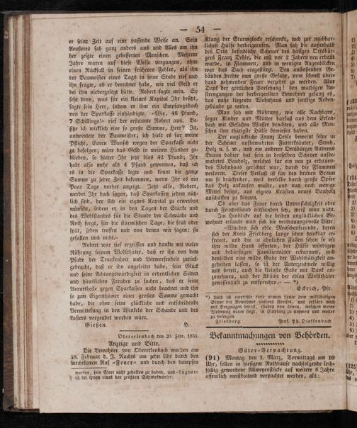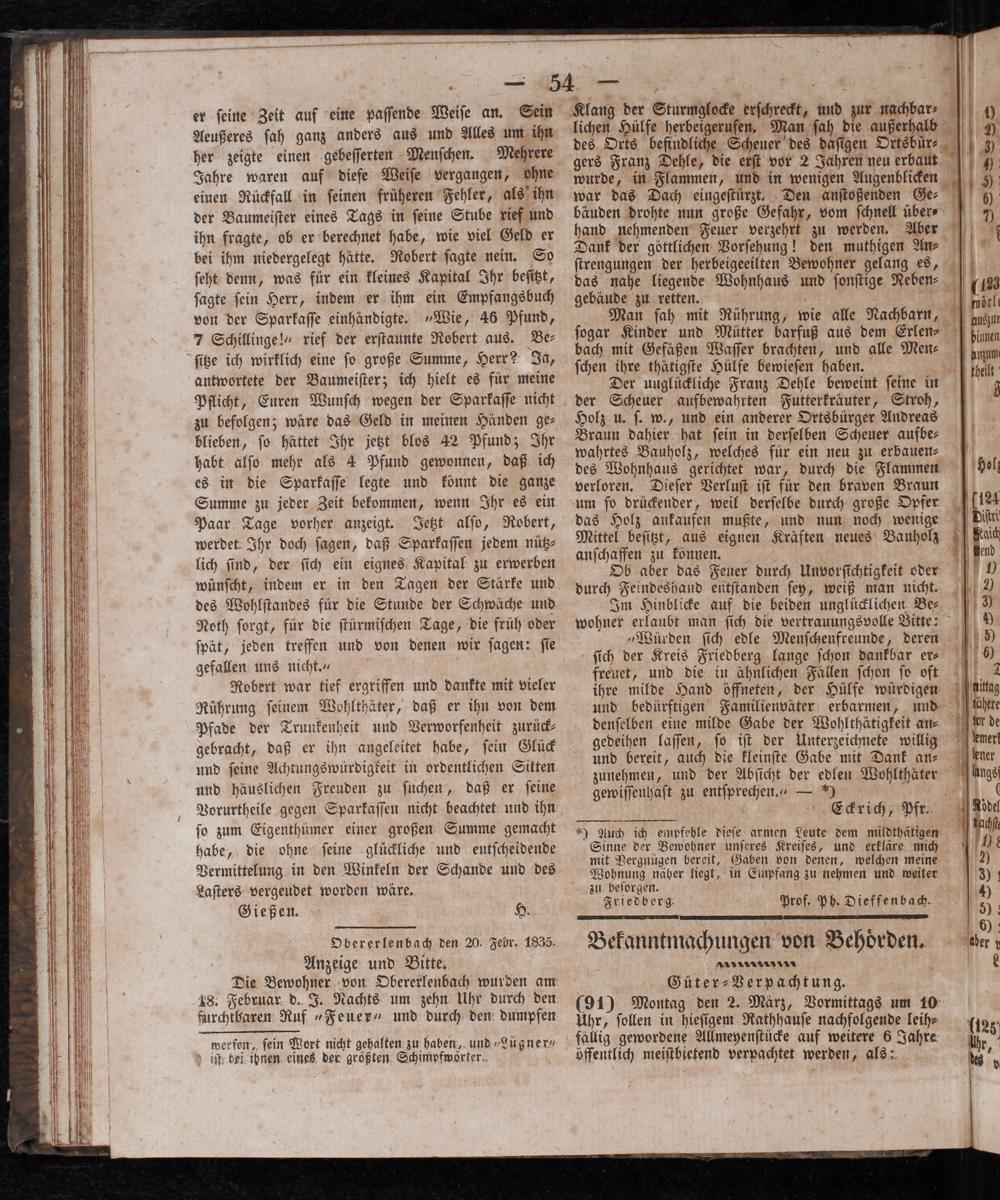 es in die Sparkaſſe legte und könnt die ganze verloren. Dieſer Verluſt iſt für den braven Braun Summe zu jeder Zeit bekommen, wenn Ihr es ein um ſo drückender, weil derſelbe durch große Opfer 124 Paar Tage vorher anzeigt. Jetzt alſo, Robert, das Holz ankaufen mußte, und nun noch wenige ii werdet Ihr doch ſagen, daß Sparkaſſen jedem nütz⸗ anl. e Kräften neues Bauholz 5 lic ſind, der ſich ein eignes Kapital zu erwerben 86 5 05 das Feber durch Unvorſtchtigkeit oder 1 wünſcht, indem er in den Tagen der Stärke und durch Feindeshaud entſtanden ſey, weiß man nicht. des Wohlſtandes für die Stunde der Schwäche und Im Hinblicke auf die beiden unglücklichen Be⸗ 37 Noth ſorgt, für die ſtürmiſchen Tage, die früh oder wohner e 1 550 1215 e 1 + 15 a ät, jeden treffen und von denen wir ſagen: ſie„Würden ſich edle Menſchenfreunde, deren 1 5 1 Aae ſich der Kreis Friedberg lange ſchon dankbar er⸗ 00 ge 3 f 17 5 freuet, und die in ähnlichen Fällen ſchon ſo oft 2 Robert war tief ergriffen und dankte mit vieler ihre milde Hand öffneten, der Hülfe würdigen dig Rührung ſeinem Wohlthäter, daß er ihn von dem und bedürftigen Familienväter erbarmen, und here Pfade der Trunkenheit und Verworfenheit zurück⸗ 90 1010 fü 1 05 10 e. 2 f gebracht, daß er ihn angeleitet habe, ſein Glück gedeihen laſſen, g iſt der Unterzeichnete willig 15 f und ſeine Achtungswurdigkeit in ordentlichen Sitten 1 i b Ae der eben 1 1 und häuslichen Freuden zu ſuchen, daß er ſeine gewiſſenhaft zu entſprechen.“— 0 5 e Vorurtheile gegen Sparkaſſen nicht beachtet und ihn f 8 Eckrich, Pfr. Adel ſo zum Eigenthümer einer großen Summe gemacht 3 Auch ich empfehle dieſe armen Leute dem mildthätigen. habe, die ohne ſeine glückliche und entſcheidende 1 e ee 1175710 1 8 05 und 9 g 1 1 4 K 1E„ enen, welchen meine Vermittelung in den Winkeln der Schande und des pb näher liegt, in Empfang zu nehmen und EN 30 Laſters vergeudet worden wäre. zu 12 0 9 8 a 4) Gießen. H. Friedberg. Prof, Ph. Dieffenbach. 5) r 25 2 00 Obererlenbach den 20 Febr. 1835. Bekanntmachungen von Behoͤrden. der; Anzeige und Bitte. n* f L Die Bewohner von Obererlenbach wurden am Güter⸗ Verpachtung.