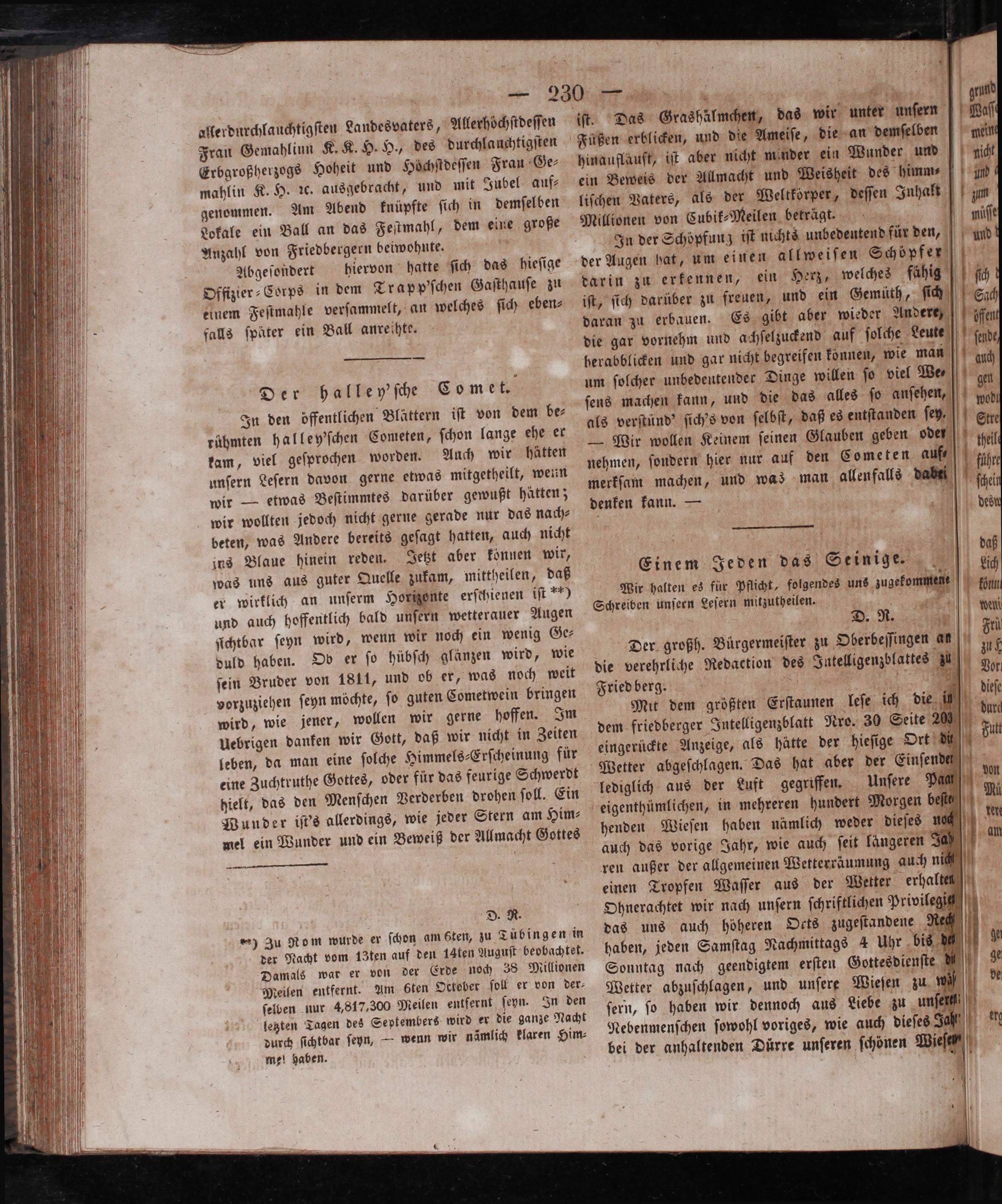 In den öffentlichen Blättern iſt von dem be⸗ rühmten halley'ſchen Cometen, ſchon lange ehe er tam, viel geſprochen worden. Auch wir hätten unſern Leſern davon gerne etwas mitgetheilt, wenn wir— etwas Beſtimmtes darüber gewußt hätten; wir wollten jedoch nicht gerne gerade nur das nach⸗ beten, was Andere bereits geſagt hatten, auch nicht ins Blaue hinein reden. Jetzt aber können wir, was uns aus guter Quelle zukam, mittheilen, daß er wirklich an unſerm Horizonte erſchienen iſt“) und auch hoffentlich bald unſern wetterauer Augen ſichtbar ſeyn wird, wenn wir noch ein wenig Ge⸗ duld haben. Ob er ſo hübſch glänzen wird, wie ſein Bruder von 1811, und ob er, was noch weit vorzuziehen ſeyn möchte, ſo guten Cometwein bringen wird, wie jener, wollen wir gerne hoffen. Im Uebrigen danken wir Gott, daß wir nicht in Zeiten leben, da man eine ſolche Himmels⸗Erſcheinung fur eine Zuchtruthe Gottes, oder für das feurige Schwerdt hielt, das den Menſchen Verderben drohen ſoll. Ein Wunder iſt's allerdings, wie jeder Stern am Him⸗ mel ein Wunder und ein Beweiß der Allmacht Gottes