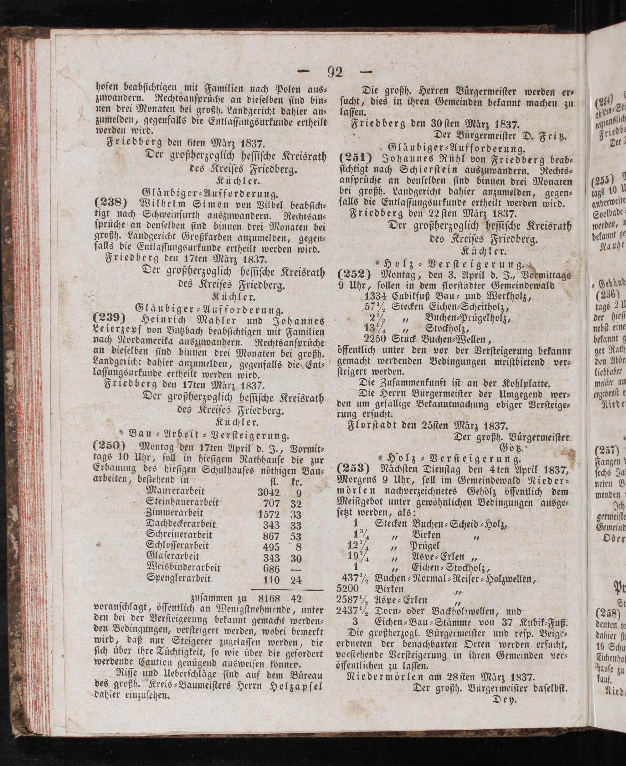 hofen beabſichtigen mit Familien nach Polen aus⸗ zuwandern. Rechtsanſprüche an dieſelben ſind bin⸗ nen drei Monaten bei großh. Landgericht dahier an⸗ zumelden, gegenfalls die Entlaſſungsurkunde ertheilt werden wird. Friedberg den 6ten März 1837. Der großherzoglich heſſiſche Kreisrath des Kreiſes Friedberg. Küchler. Gläubiger⸗ Aufforderung. (238) Wilhelm Simon von Vilbel beabſich⸗ tigt nach Schweinfurth auszuwandern. Rechtsan⸗ ſprüche an denſelben ſind binnen drei Monaten bei großh. Landgericht Großkarben anzumelden, gegen⸗ falls die Entlaſſungsurkunde ertheilt werden wird. Friedberg den 17ten März 1837. Der großherzoglich heſſiſche Kreisrath des Kreiſes Friedberg. Küchler. Gläubiger⸗ Aufforderung. (239) Heinrich Mahler und Johannes Le ierzepf von Butzbach beabſichtigen mit Familien nach Nordamerika auszuwandern. Rechtsanſprüche an dieſelben ſind binnen drei Monaten bei großh. Landgericht dahier anzumelden, gegenfalls die Ent⸗ laſſungsurkunde ertheilt werden wird. Friedberg den 17ten März 1837. Der großherzoglich heſſiſche Kreisrath des Kreiſes Friedberg. Küchler. Bau ⸗ Arbeit-Verſteigerung. (250) Montag den 17ten April d. J., Vormit⸗ tags 10 Uhr, ſoll in hieſigem Rathhauſe die zur Erbauung des hieſigen Schulhauſes nöthigen Bau⸗