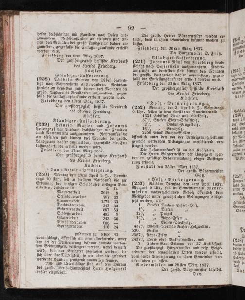 laſſen. Friedberg den 30 ſten März 1837. 95 Der Bürgermeiſter D. Fritz Gläubiger⸗Aufforderung. (251) Johaunes Rühl von Friedberg beab⸗ ſichtigt nach Schierſtein auszuwandern. Rechts⸗ anſprüche an denſelben ſind binnen drei Monaten bei großh. Landgericht dahier anzumelden, gegen⸗ falls die Entlaſſungsurkunde ertheilt werden wird. Friedberg den 22 ſten März 1837. 1 Der großherzoglich heſſiſche Kreisrath des Kreiſes Friedberg. Küchler. g Holz ⸗ e N (252) Montag, den 3. April d. J., V mittags 9 Uhr, ſollen in dem florſtädter Gemeindewald 1334 Cubikfuß Bau⸗ und Werkholz,