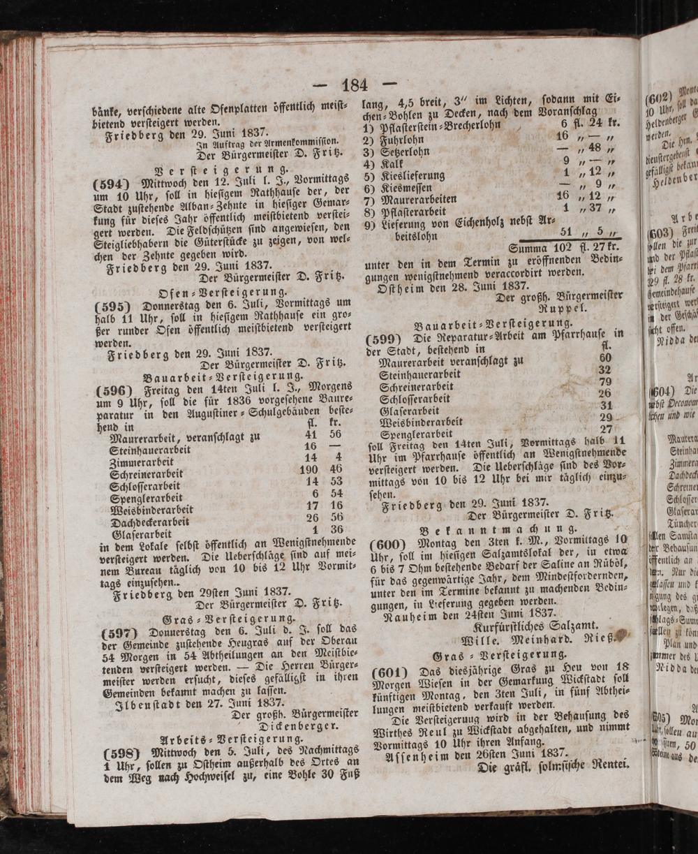 in dem Lokale ſelbſt öffentlich an Wenigſtnehmende verſteigert werden. Die Ueberſchläge ſind auf mei⸗ nem Bureau täglich von 10 bis 12 Uhr Vormit⸗ tags einzuſehen. Friedberg den 29ſten Juni 1837. Der Bürgermeiſter D. Fritz. Gras-Verſteigerung. (597) Donnerstag den 6. Juli d. J. ſoll das der Gemeinde zuſtehende Heugras auf der Oberau 54 Morgen in 54 Abtheilungen an den Meiſtbie⸗ tenden verſteigert werden.— Die Herren Bürger⸗ meiſter werden erſucht, dieſes gefälligſt in ihren Gemeinden bekannt machen zu laſſen. Ilbenſtadt den 27. Juni 1837. Der großh. Bürgermeiſter Dickenberger. Arbeits⸗Verſteigerung.