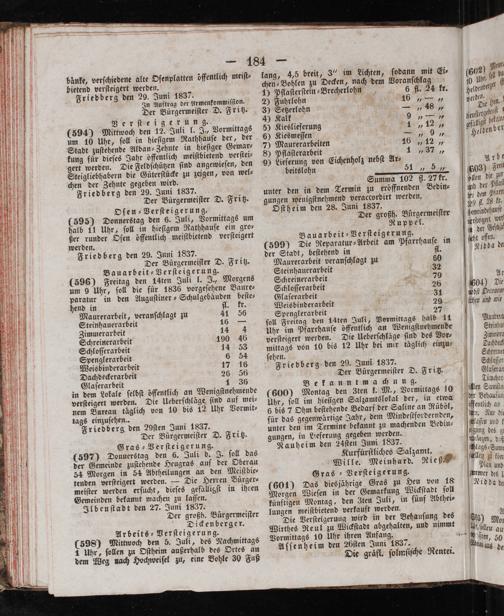 ſehen. Friedberg den 29. Juni 1837. Der Bürgermeiſter D. Fritz. Bekanntmachung. (600) Montag den Zten k. M., Vormittags 10 Uhr, ſoll im hieſigen Salzamtslokal der, in etwa 6 bis 7 Ohm beſtehende Bedarf der Saline an Rüböl, für das gegenwärtige Jahr, dem Mindeſtfordernden, unter den im Termine bekannt zu machenden Bedin⸗ gungen, in Lieferung gegeben werden. Nauheim den 24ſten Juni 1837. Kurfuͤrſtliches Salzamt. Wille. Meinhard. Rie 6. Gras ⸗Verſteigerung. (601) Das diesjährige Gras zu Heu von 18 Morgen Wieſen in der Gemarkung Wickſtadt ſoll künftigen Montag, den Zten Juli, in fünf Abthei⸗ lungen meiſtbietend verkauft werden.