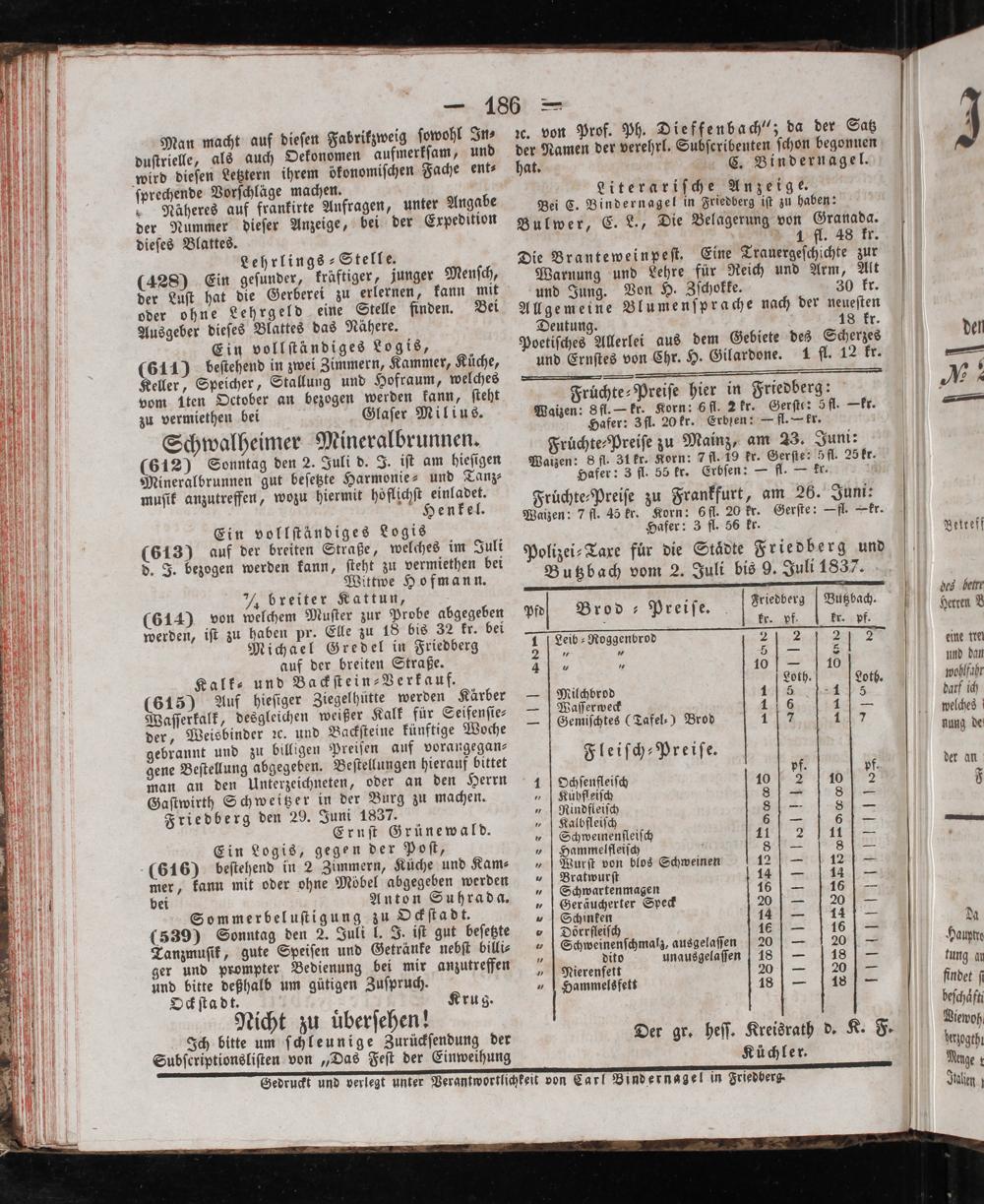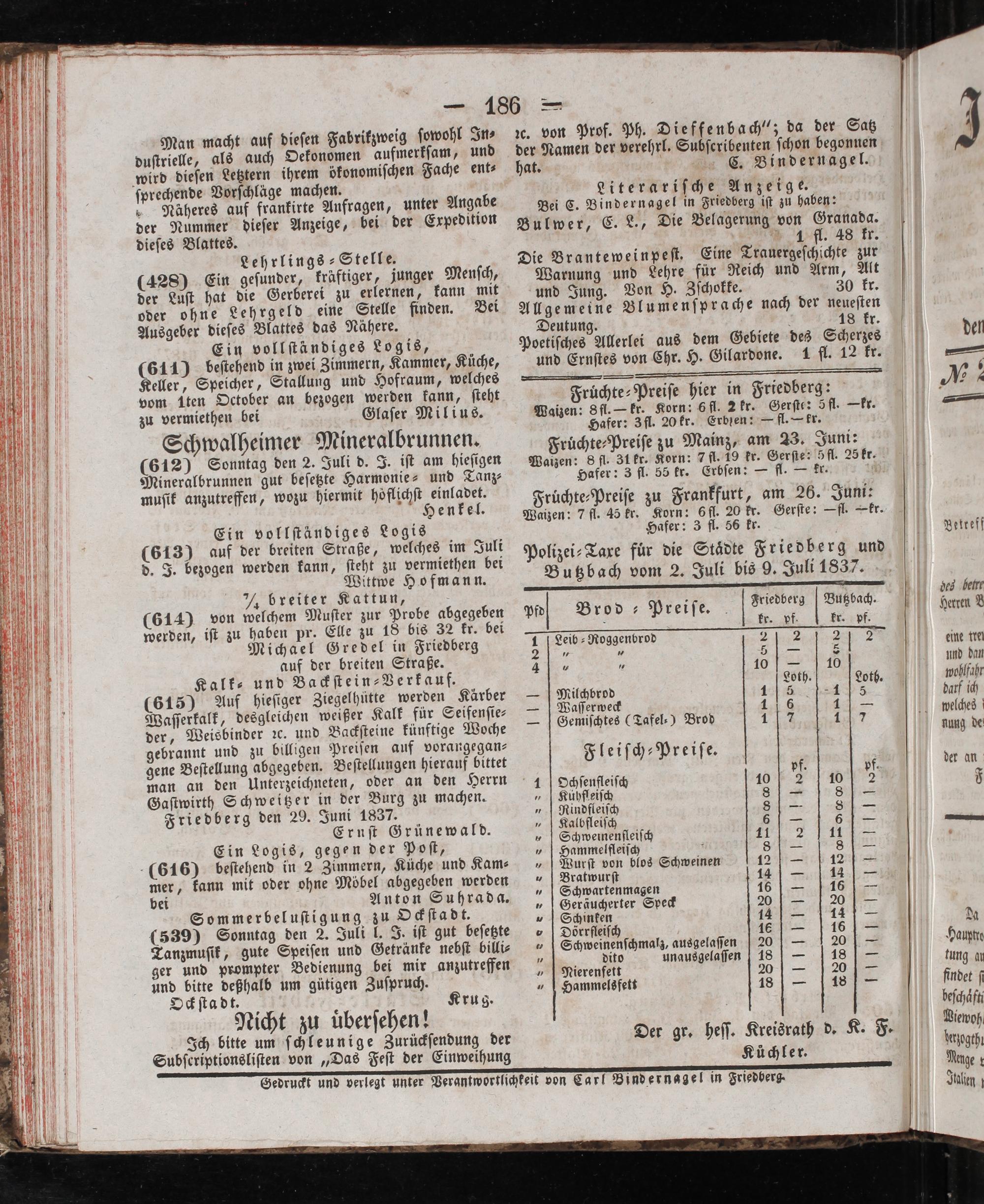 ꝛc. von Prof. Ph. Dieffenbach“; da der Satz der Namen der verehrl. Subſeribenten ſchon begonnen hat. C. Bindernagel. Literariſche Anzeige. Bei C. Bindernagel in Friedberg iſt zu haben: Bulwer, E. L., Die Belagerung von Granada. 1 fl. 48 kr. Die Branteweinpeſt. Eine Trauergeſchichte zur Warnung und Lehre für Reich und Arm, Alt und Jung. Von H. Zſchokke. 30 kr. Allgemeine Blumenſprache nach der neueſten Deutung. a 18 kr. Poetiſches Allerlei aus dem Gebiete des Scherzes und Ernſtes von Chr. H. Gilardone. 1 fl. 12 kr.