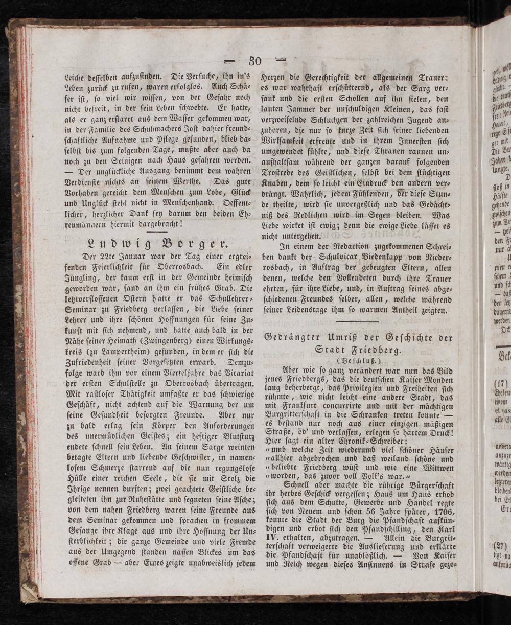 Der 22te Januar war der Tag einer ergrei— fenden Feierlichkeit fur Oberrosbach. Ein edler Jüngling, der kaum erſt in der Gemeinde heimiſch geworden war, fand an ihm ein frühes Grab. Die letztverfloſſenen Oſtern hatte er das Schullehrer— Seminar zu Friedberg verlaſſen, die Liebe ſeiner Lehrer und ihre ſchönen Hoffnungen für ſeine Zu— kunft mit ſich nehmend, und hatte auch bald in der Nähe ſeiner Heimath(Zwingenberg) einen Wirkungs— kreis(zu Lampertheim) gefunden, in dem er ſich die Zufriedenheit ſeiner Vorgeſetzten erwarb. Demzu— folge ward ihm vor einem Vierteljahre das Vicariat der erſten Schulſtelle zu Oberrosbach übertragen. Mit raſtloſer Thätigkeit umfaßte er das ſchwierige Geſchäft, nicht achtend auf die Warnung der um ſeine Geſundheit beſorgten Freunde. Aber nur zu bald erlag ſein Körper den Anforderungen des unermüdlichen Geiſtes; ein heftiger Blutſturz endete ſchnell ſein Leben. An ſeinem Sarge weinten betagte Eltern und liebende Geſchwiſter, in namen— loſem Schmerze ſtarrend auf die nun regungsloſe Hulle einer reichen Seele, die ſie mit Stolz die Ihrige nennen durften; zwei geachtete Geiſtliche be— gleiteten ihn zur Ruheſtätte und ſegneten ſeine Aſche; von dem nahen Friedberg waren ſeine Freunde aus dem Seminar gekommen und ſprachen in frommem Geſange ihre Klage aus und ihre Hoffnung der Un— ſterblichkeit; die ganze Gemeinde und viele Fremde aus der Umgegend ſtanden naſſen Blickes um das offene Grab— aber Eines zeigte unabweislich jedem