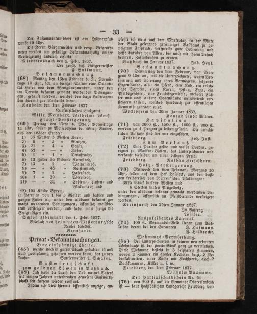 Friedberg. 3 ame Verkauf. (72) Eine Parthie gelbe und weiße Borden, ge⸗ eignet zu Masken-Bällen, hat Unterzeichneter und verkauft dieſelben um einen billigen Preis. Friedberg. Nathan Hirſchhorn. Holz⸗Verſteigerung. (73) Mittwoch den Sten Februar, Morgens 10 Uhr, ſollen auf dem Hof Haſeleck, aus den daſi⸗ gen freiherrlich von Ritter'ſchen Waldungen: 3925 Stück birkene Wellen und 6 Stecken birken Prügelholz, unter den alsdann bekannt gemacht werdenden Be— dingungen, öffentlich an Meiſtbietende verſteigert werden. Steinfurth den 29ten Januar 1837. In Auftrag Löffler. Auszuleihendes Kapital. (74) 100 fl. Vormunds⸗Geld liegen zum Aus⸗ leihen bereit bei den Curatoren H. Hofmann. F. Hilbrecht. Wohnungs⸗Vermiethung. (75) Bei Unterzeichnetem in ſeinem neu erbauten Wohnhauſe iſt der zweite Stock ganz zu vermiethen. Dieſe Wohnung beſteht in 3 heizbaren Zimmern, wovon 2 Zimmer ein großer Kochofen heizt, 2 Ne⸗ benkabinetten, einer Küche mit Kochheerd, auch 2 Dachkammern, Keller u. ſ. w. Friedberg den Iten Februar 1837. Wilhelm Baumann. Der Partialſchuldſchein Nr. 61 (76) von 200 fl. auf die Gemeinde Obererlenbach iſt— laut hochlöblichem Landgericht Friedberg vor⸗