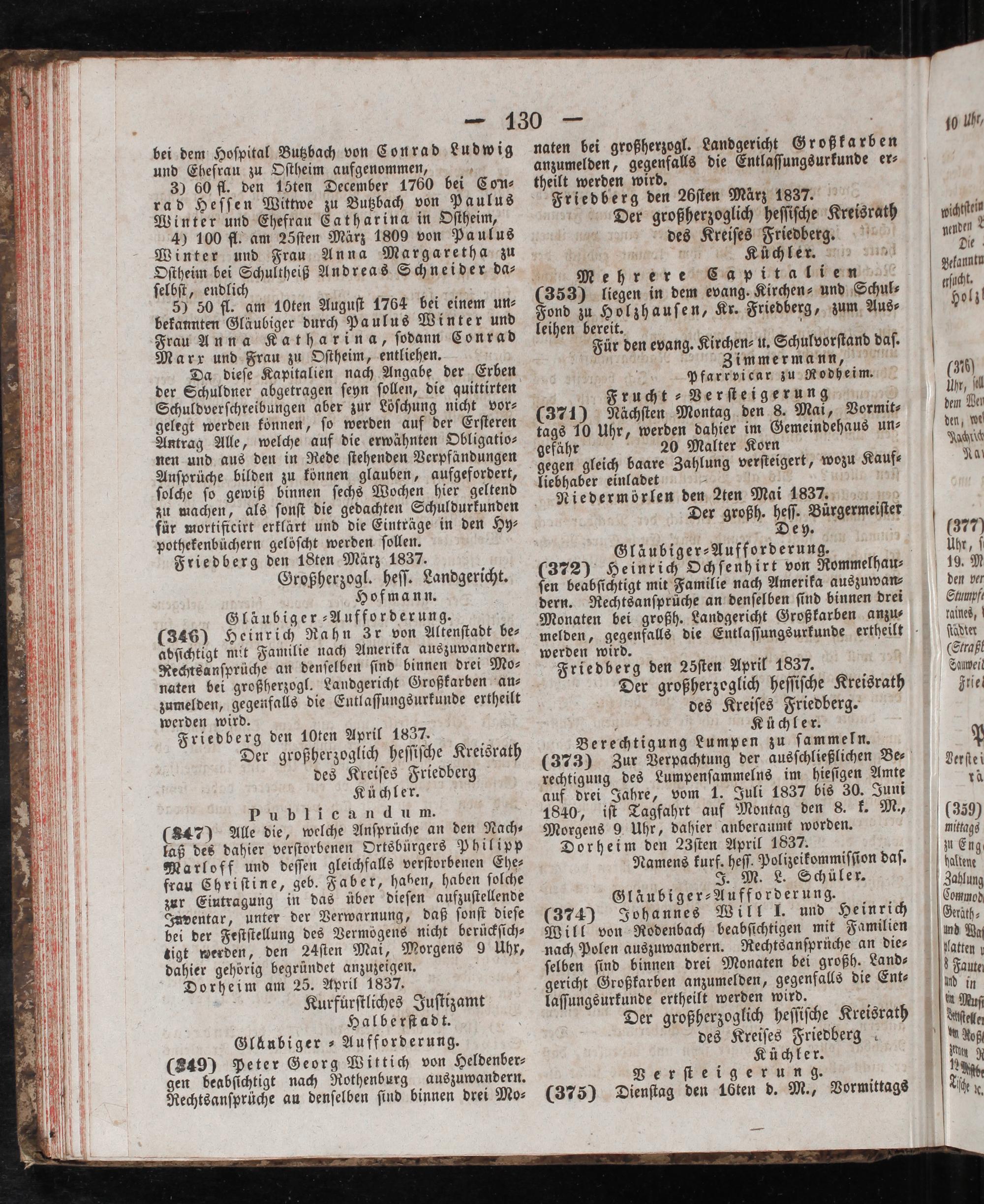 Morgens 9 Uhr, dahier anberaumt worden. Dorheim den 23ſten April 1837. Namens kurf. heſſ. Polizeikommiſſion daſ. J. M. L. Schüler. Gläubiger-Aufforderung. (374) Johannes Will J. und Heinrich Will von Rodenbach beabſichtigen mit Familien nach Polen auszuwandern. Rechtsanſprüche an die⸗ ſelben ſind binnen drei Monaten bei großh. Land⸗ gericht Großkarben anzumelden, gegenfalls die Ent⸗ laſſungsurkunde ertheilt werden wird. Der großherzoglich heſſiſche Kreisrath des Kreiſes Friedberg Küchler. Verſteigerung. (375) Dienſtag den 16ten d. M., Vormittags