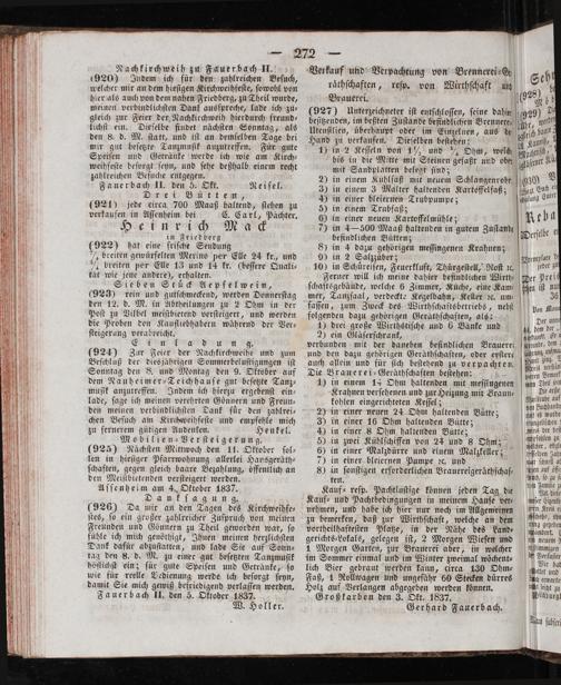 Fauer bach II. den 5. Oktober 1837. W. Holler.