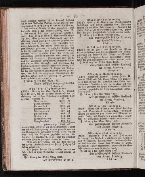 Friedberg den 17ten Marz 1837. Der großherzoglich heſſiſche Kreisrath des Kreiſes Friedberg. Küchler.